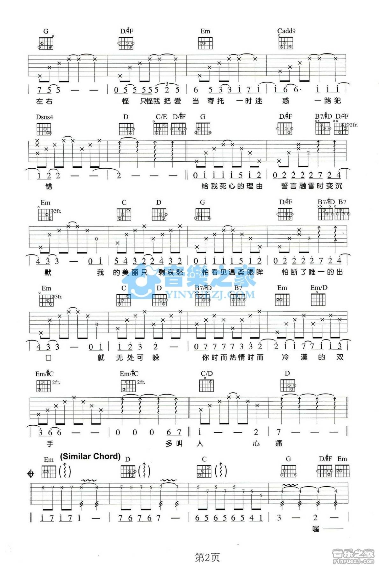 曲谱介绍: 卢家宏G调版飞儿乐团《死心的理由》吉他弹唱六线谱