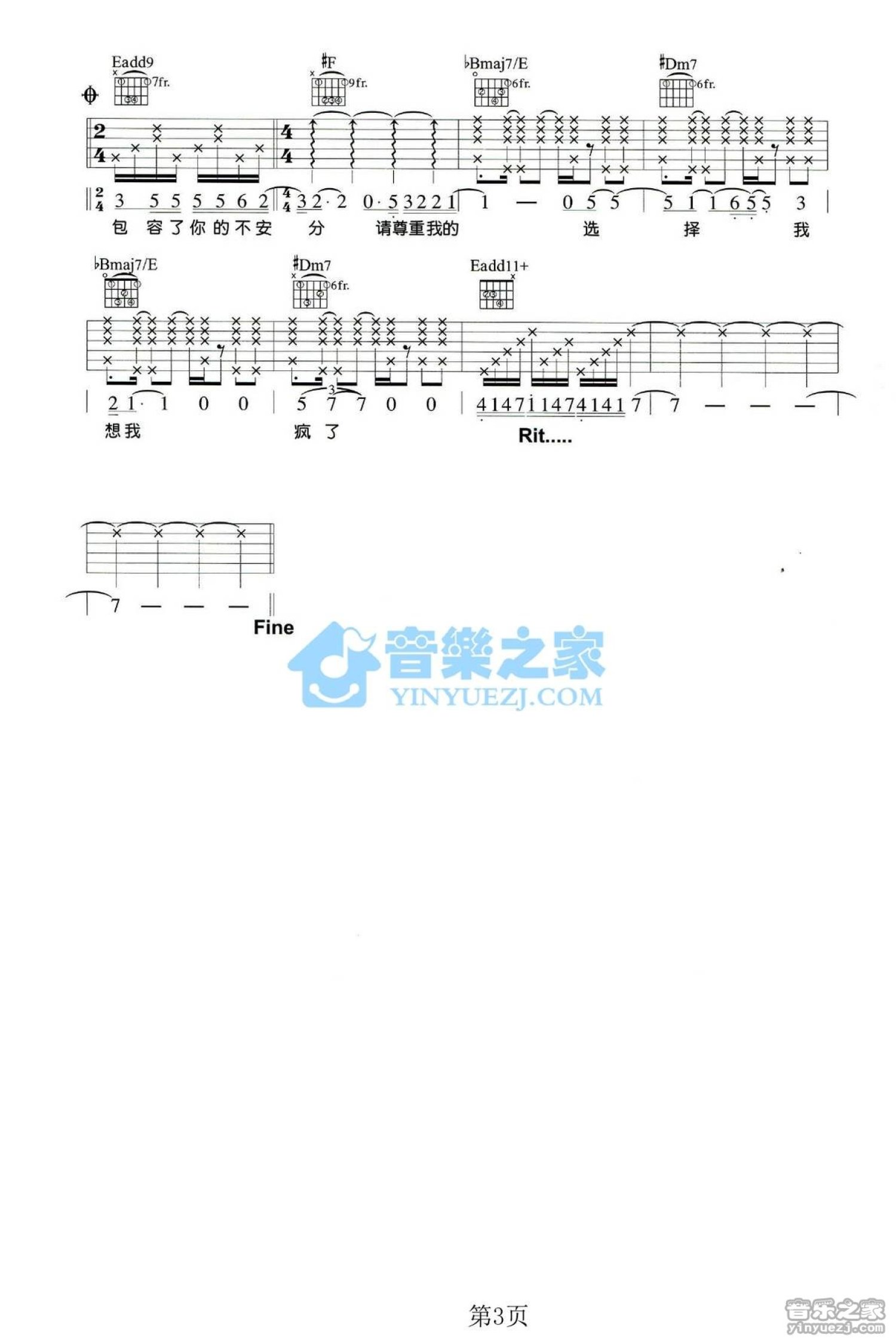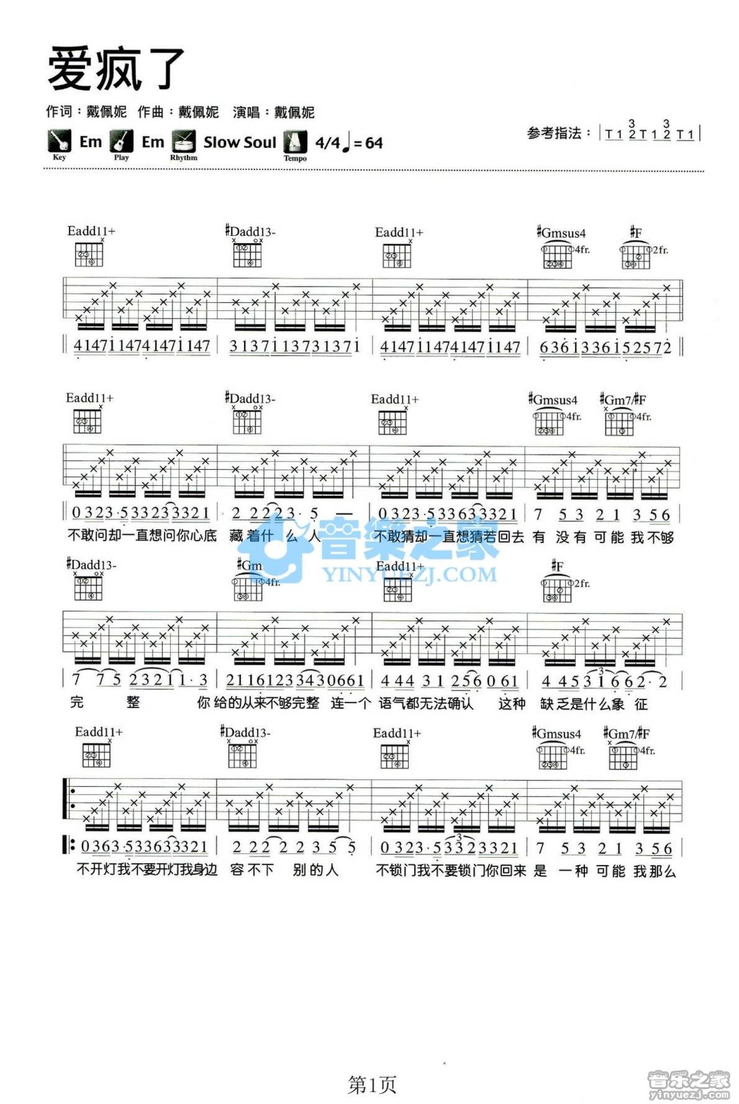 曲谱介绍: Em调版 戴佩妮《爱疯了》吉他弹唱六线谱