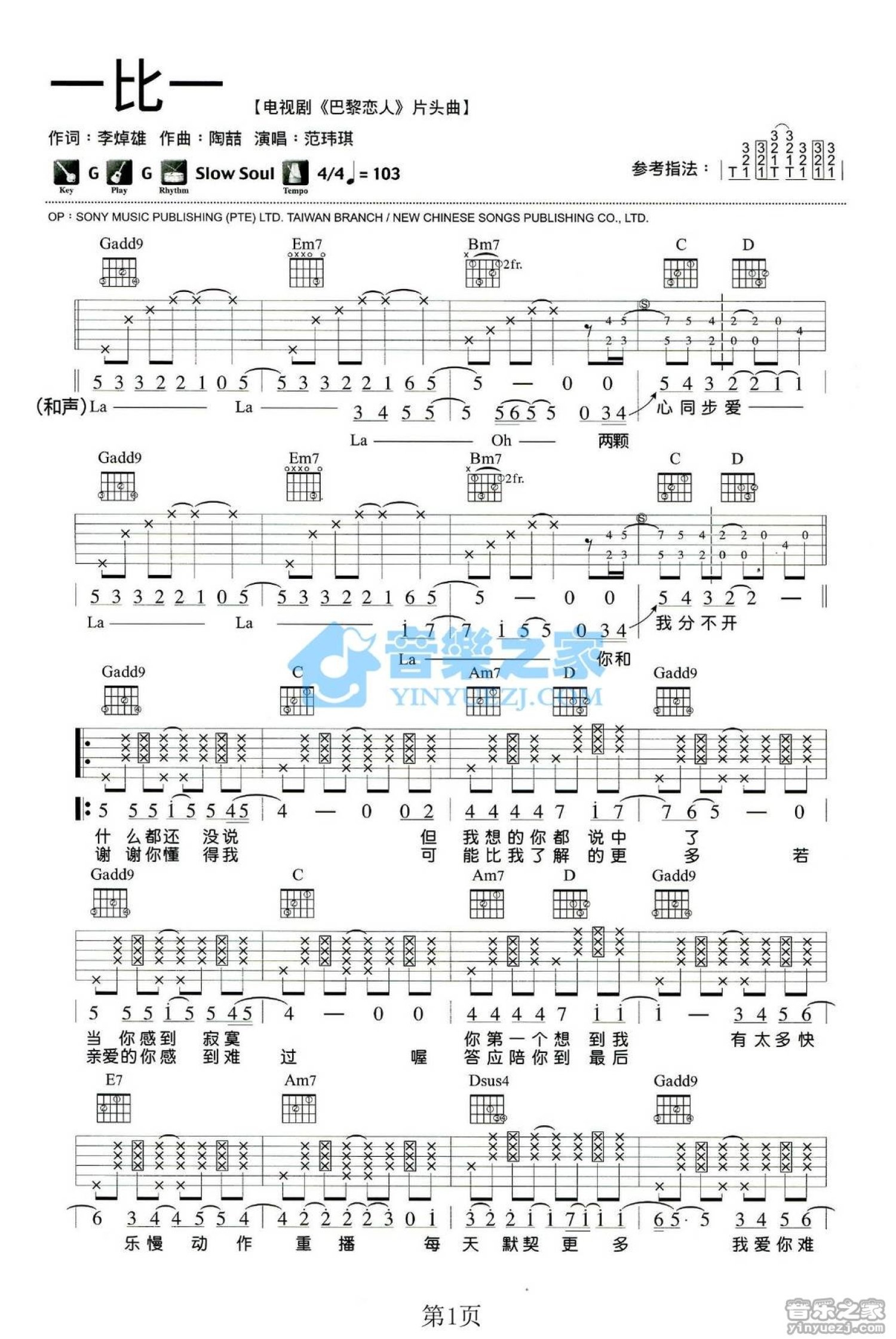 曲谱介绍: 卢家宏G调版 范玮琪《一比一》吉他弹唱六线谱