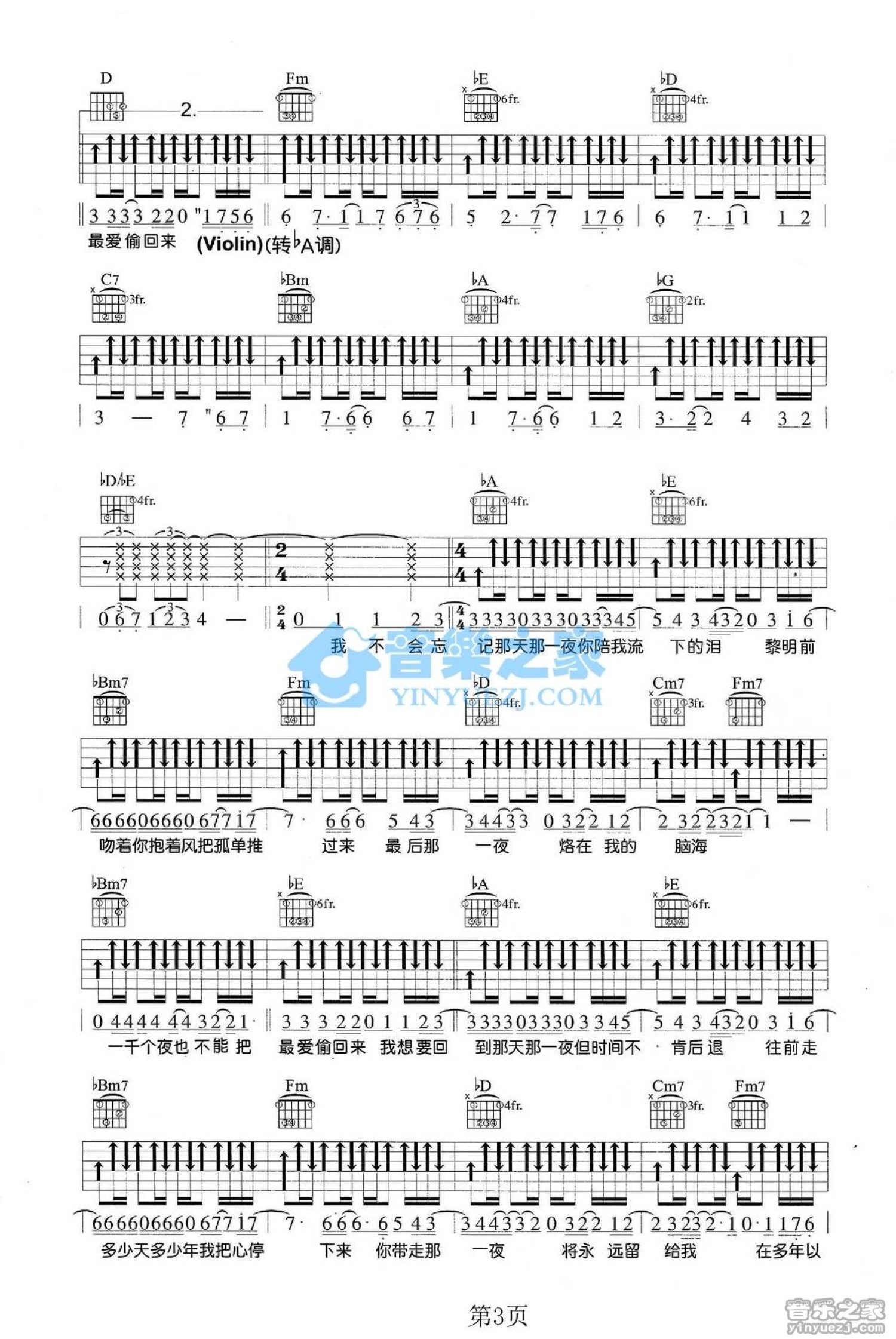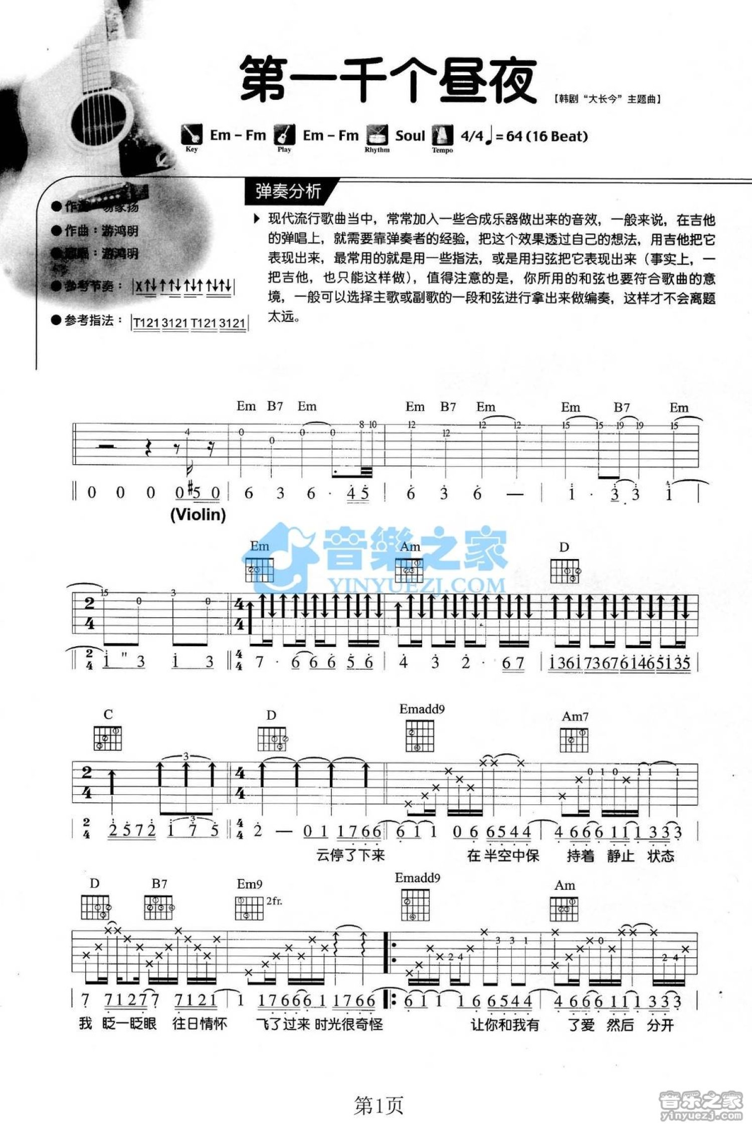 曲谱介绍: Em转Fm调版 游鸿明《第一千个昼夜》吉他弹唱六线谱