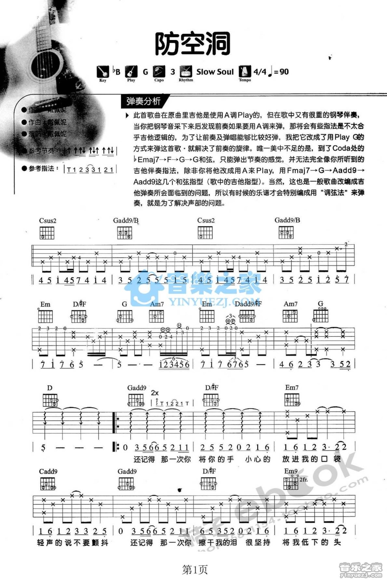 曲谱介绍: G调版 戴佩妮《防空洞》吉他弹唱六线谱
