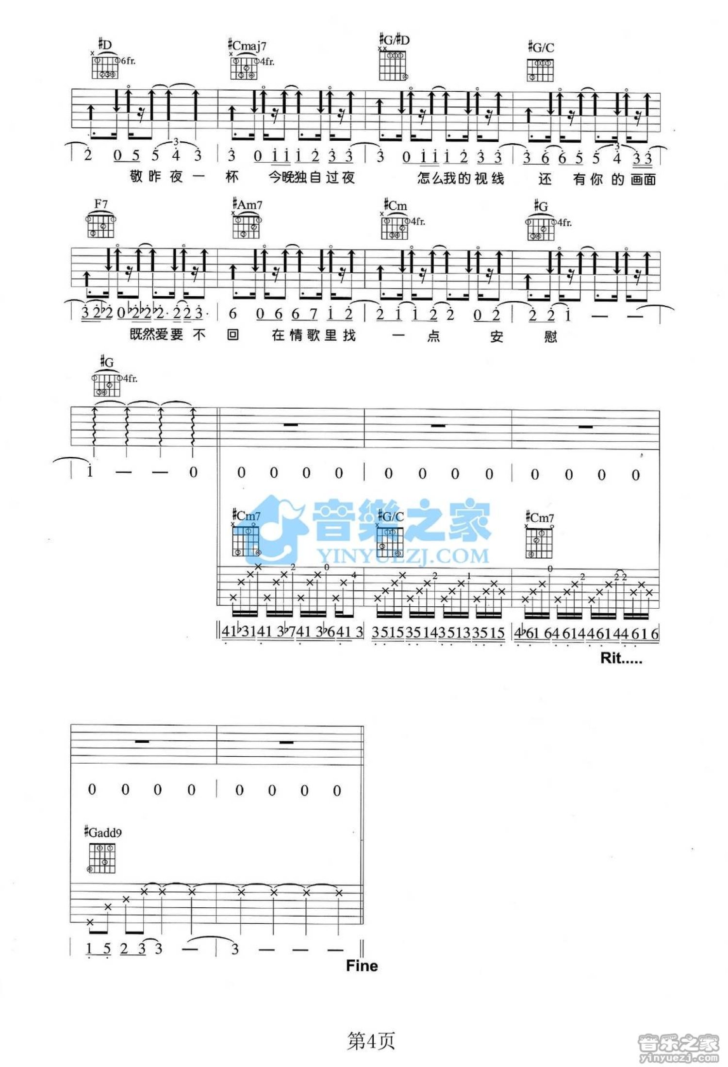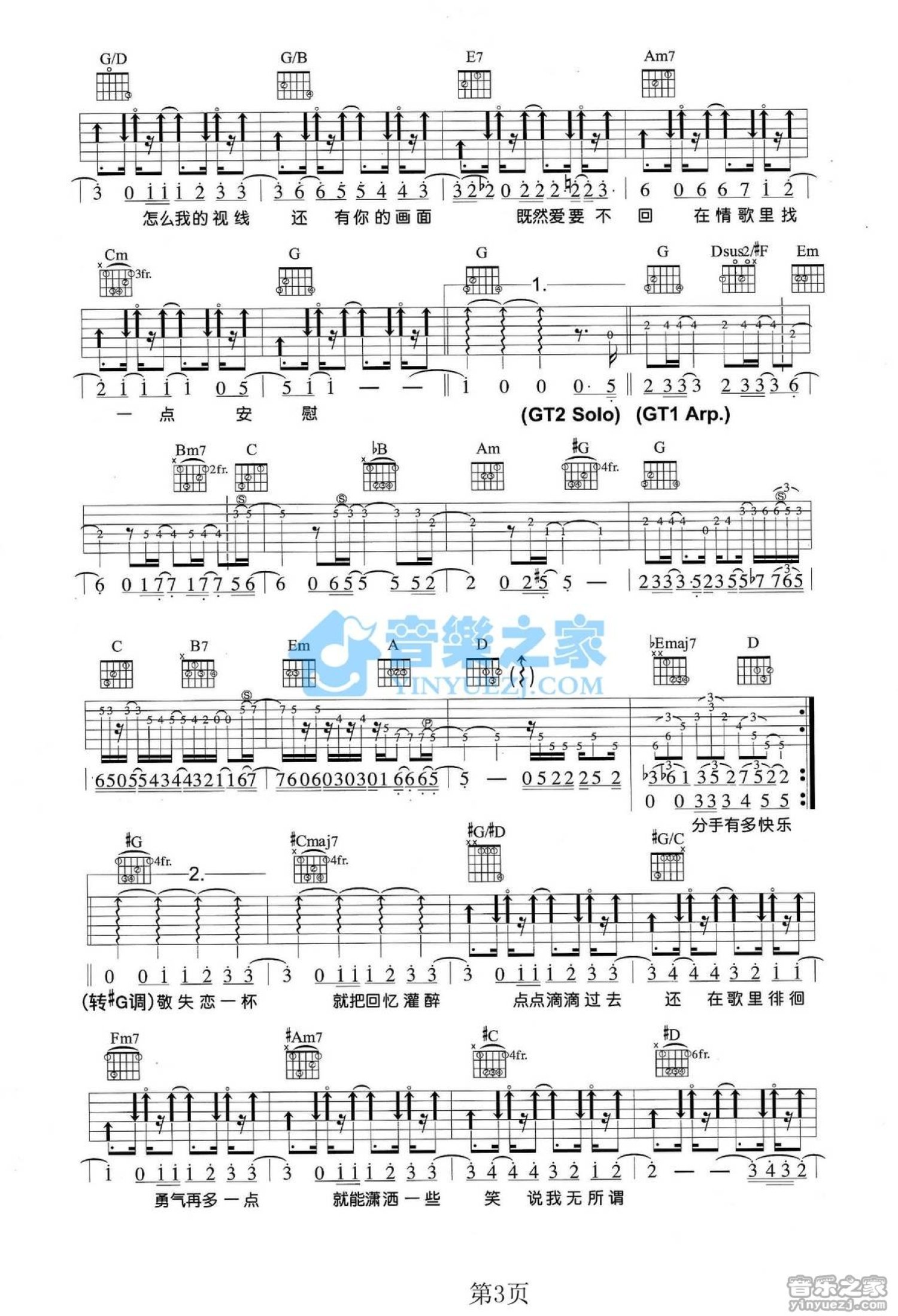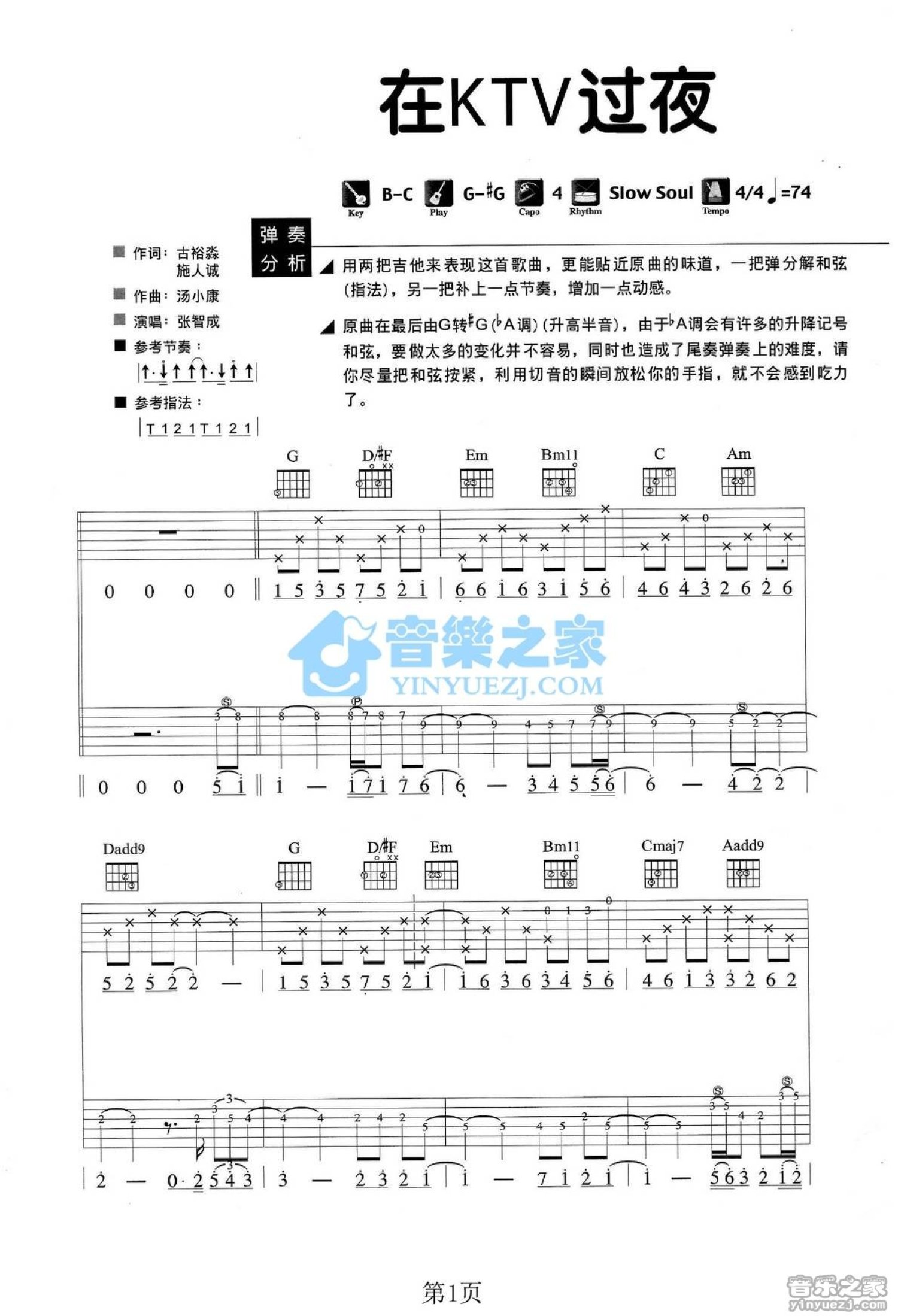 曲谱介绍: G转#G调版 张智成《在KTV过夜》吉他弹唱六线谱