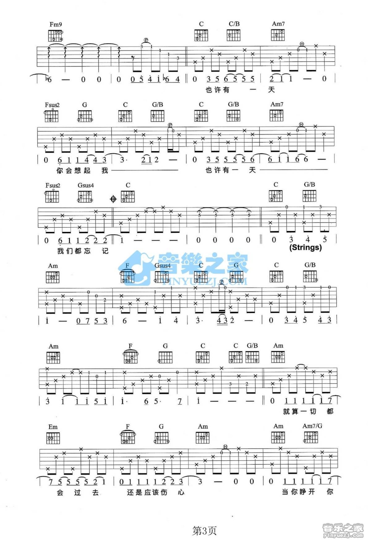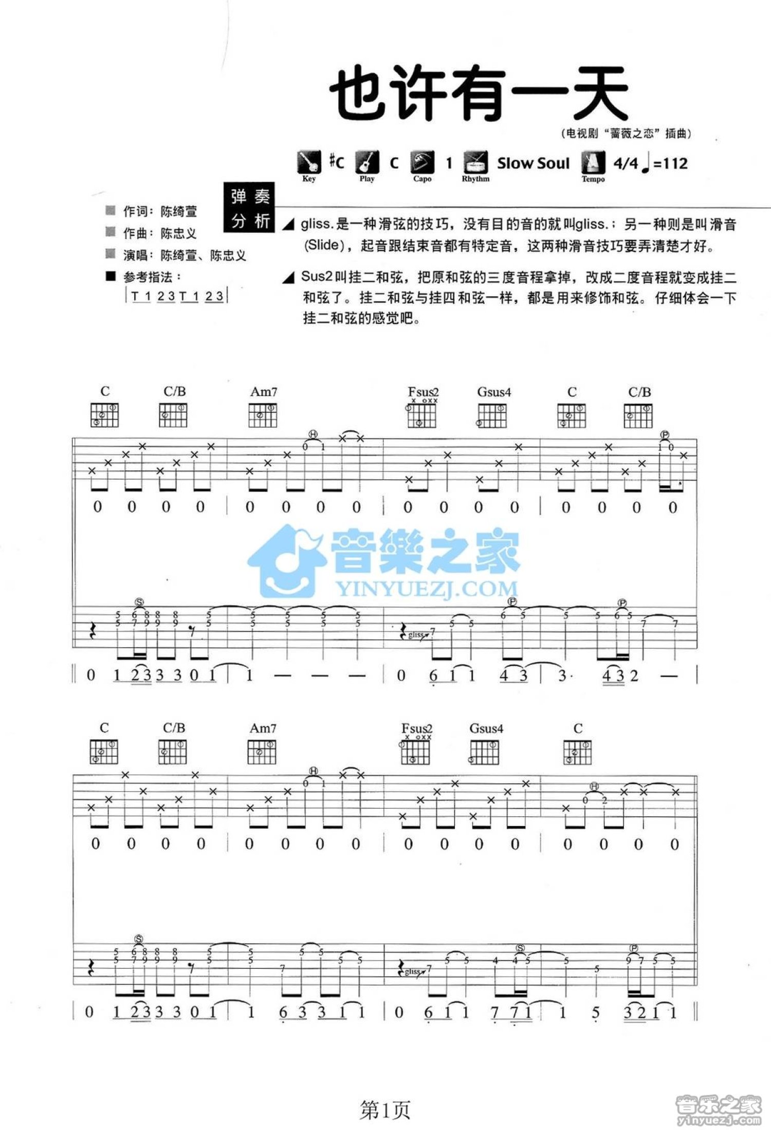 曲谱介绍: C调版 JS《也许有一天》吉他弹唱六线谱