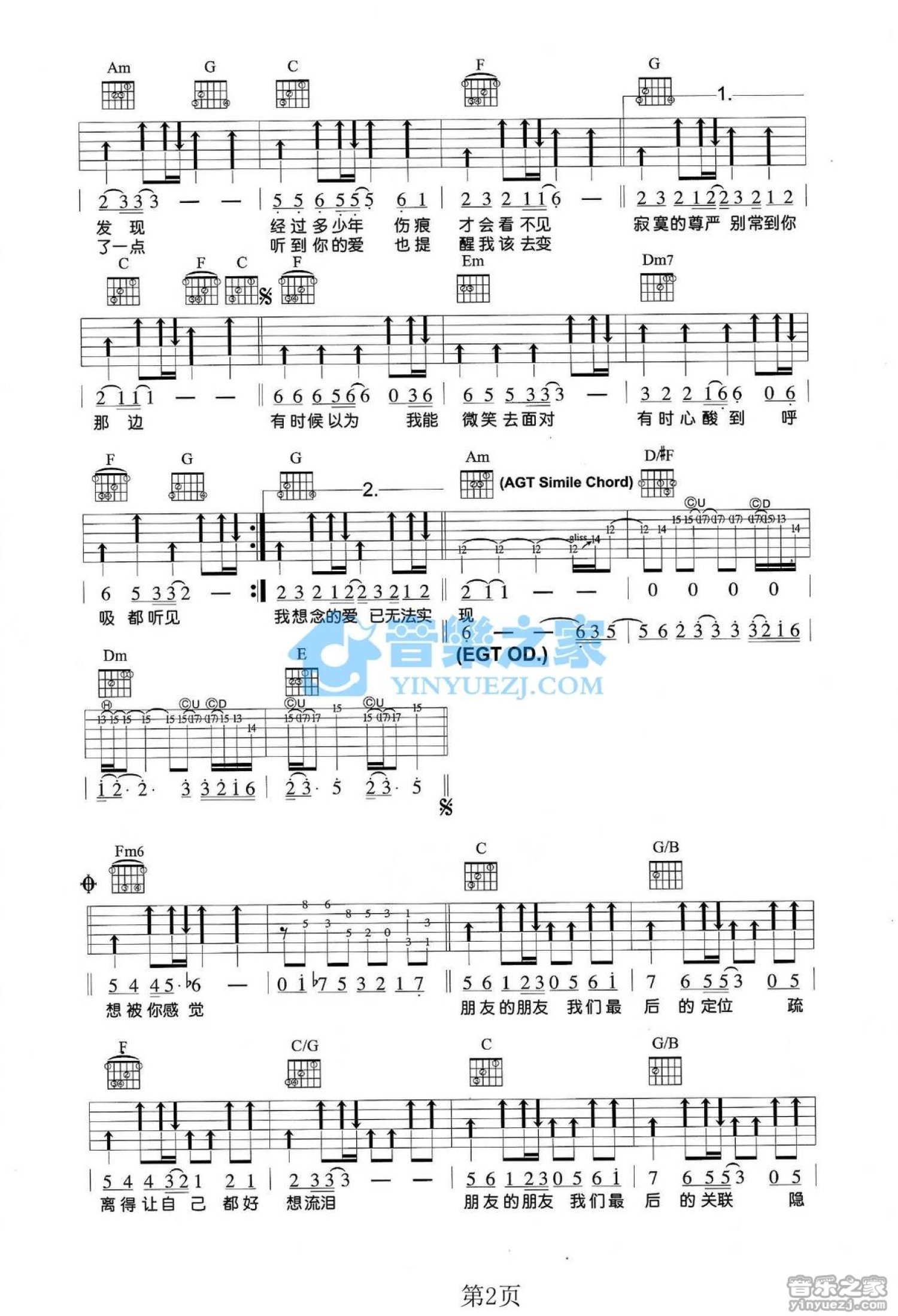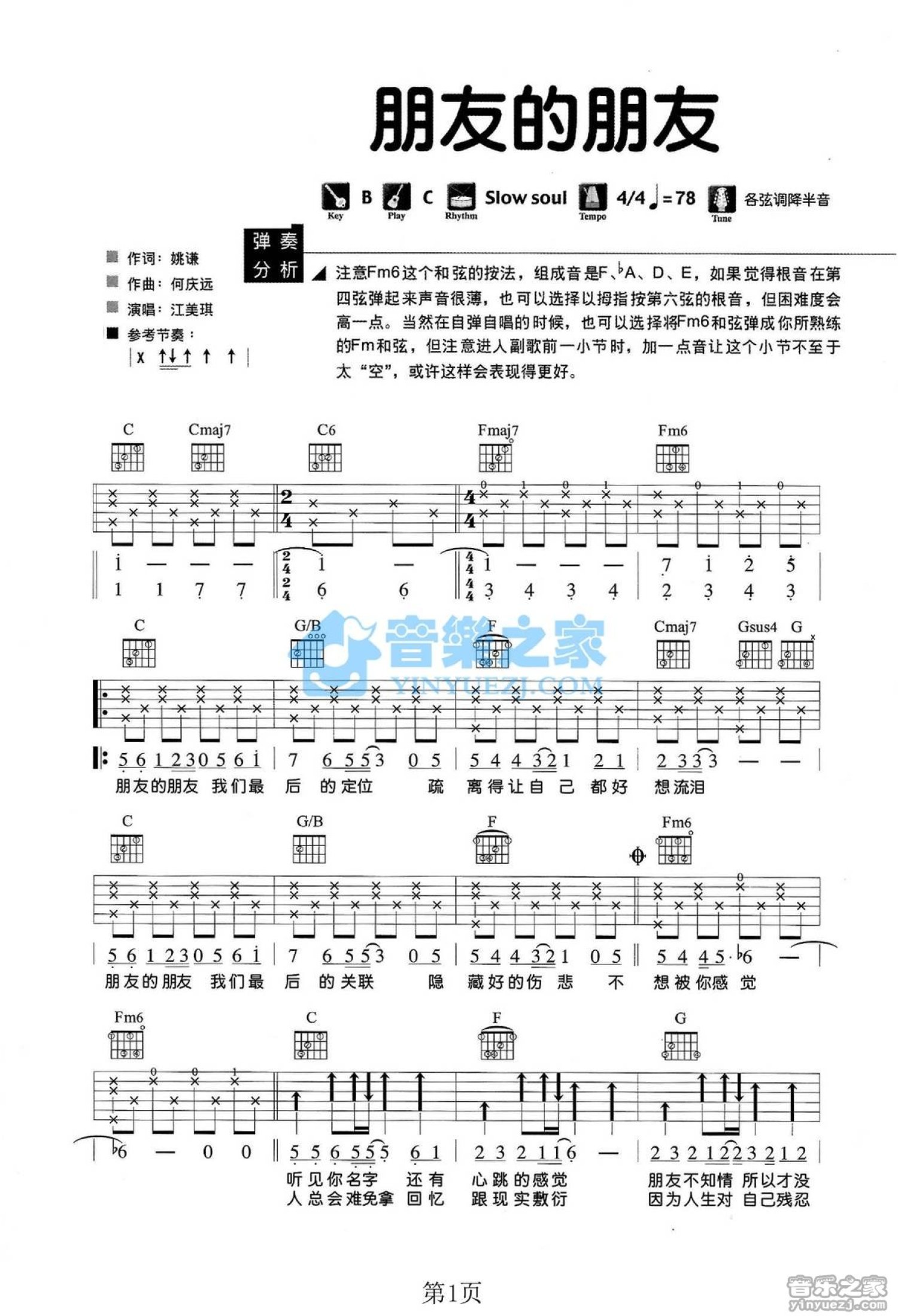 曲谱介绍: 卢家宏C调版江美琪《朋友的朋友》吉他弹唱六线谱