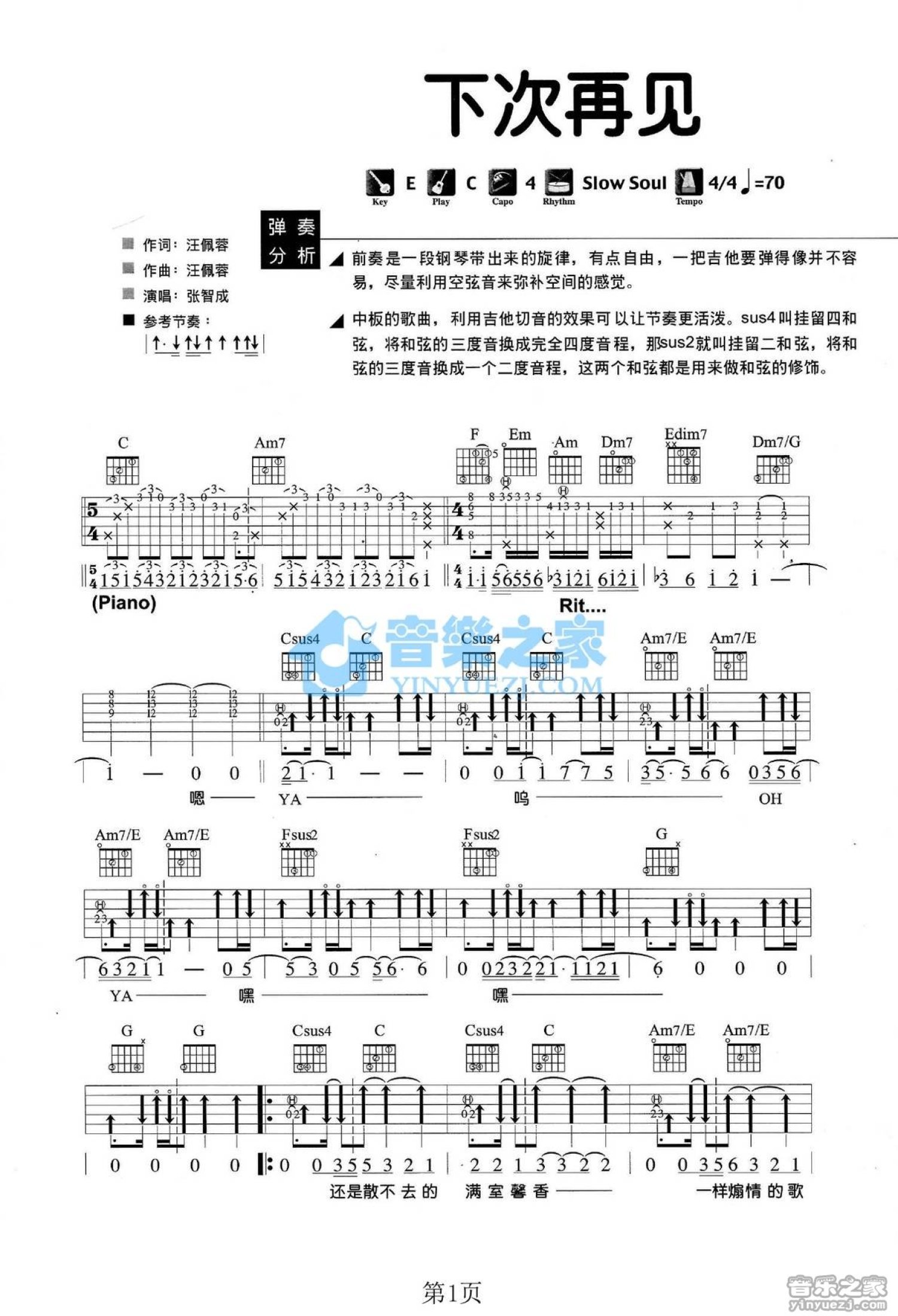 曲谱介绍: C调版 张智成《下次再见》吉他弹唱六线谱