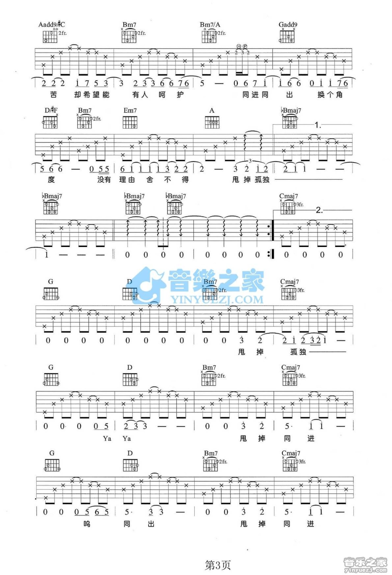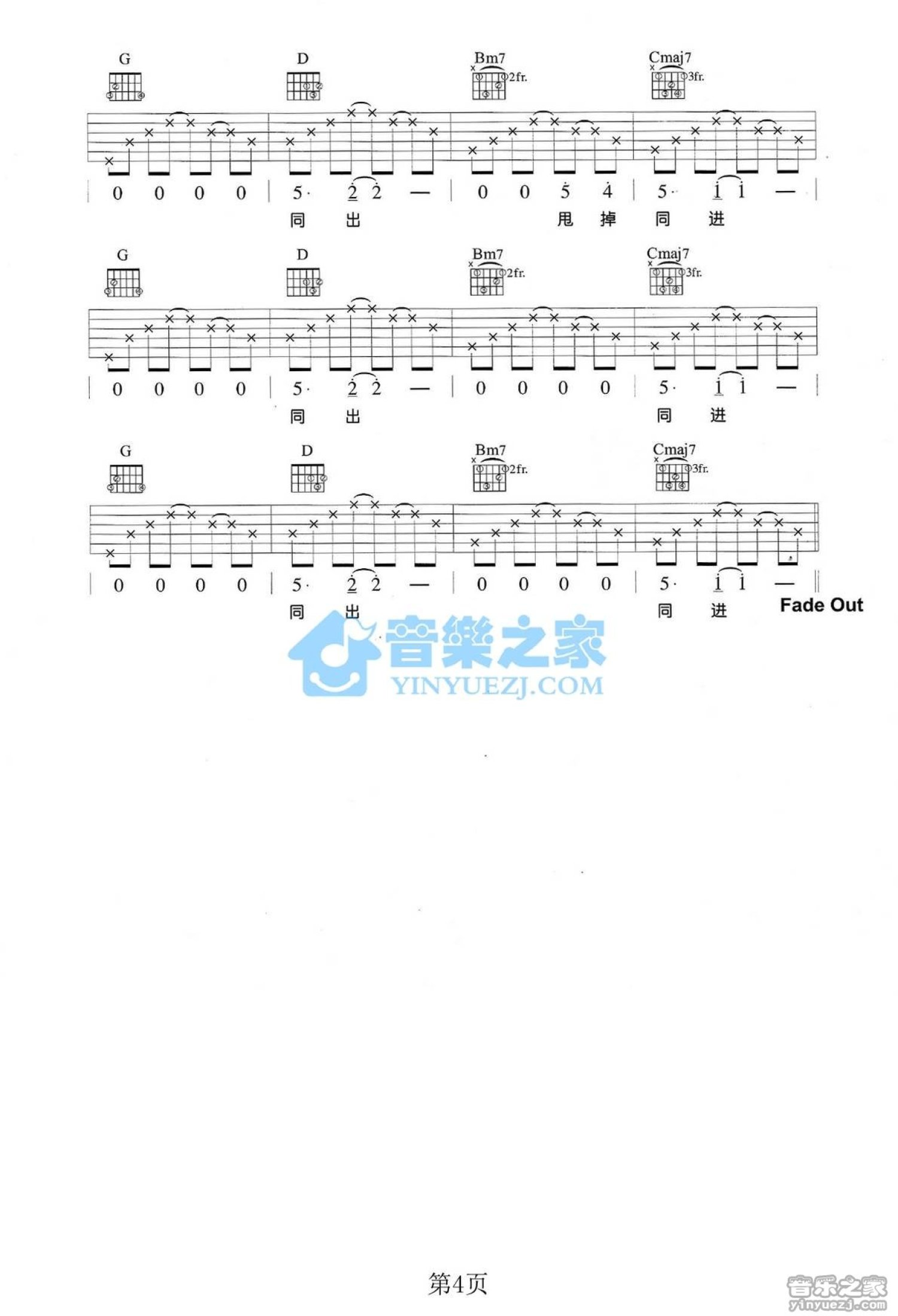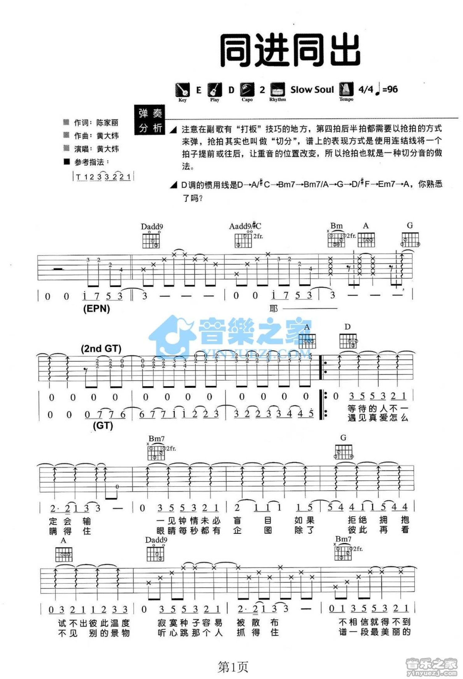 曲谱介绍: D调版 黄大炜《同进同出》吉他弹唱六线谱