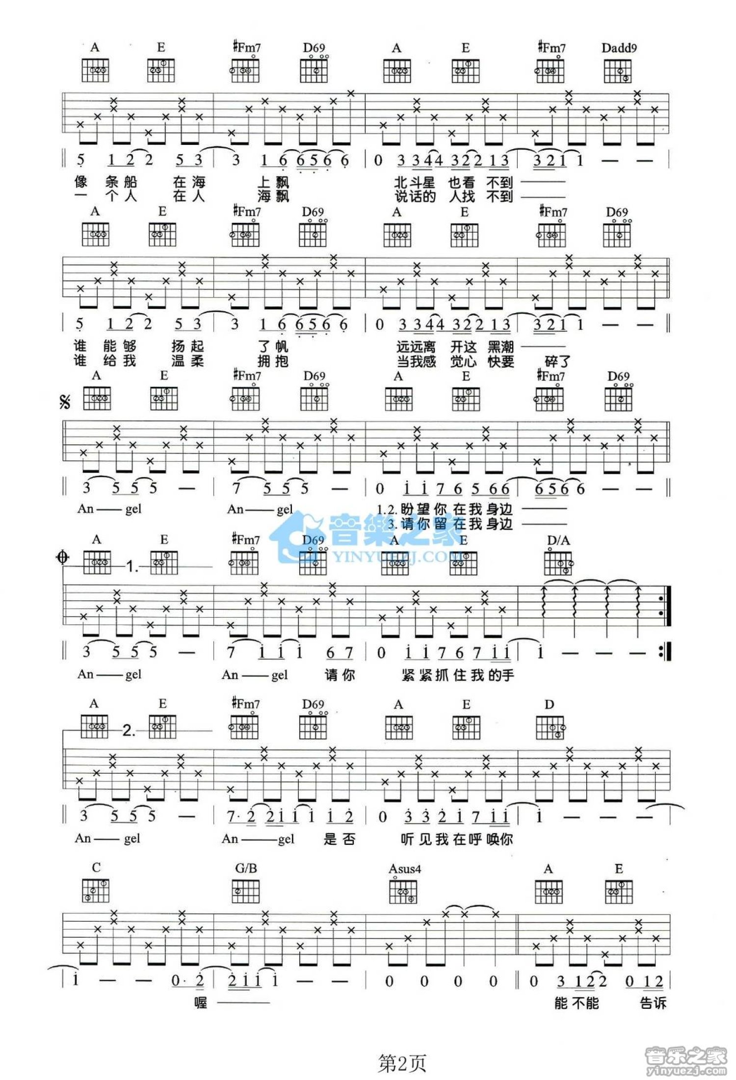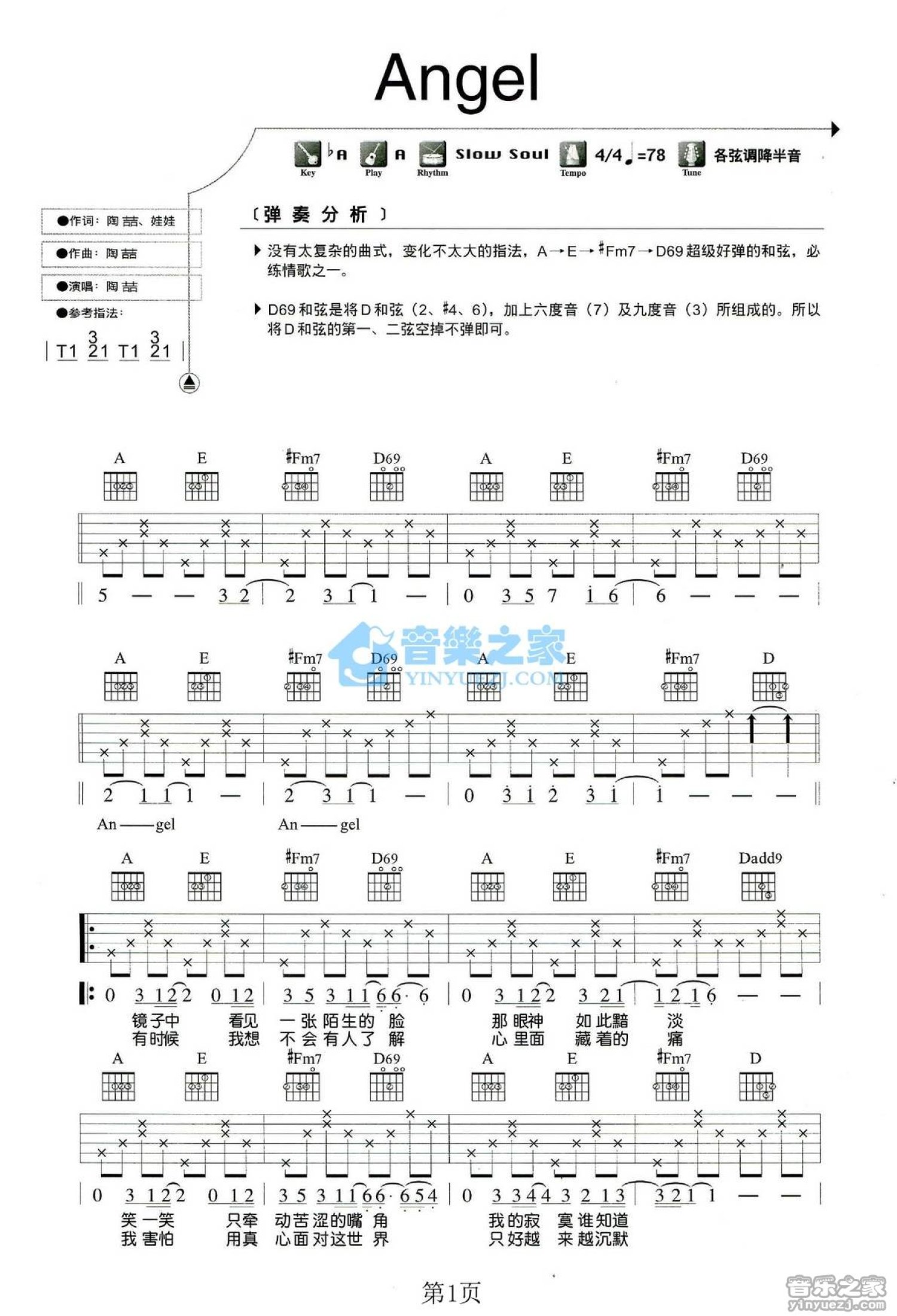 曲谱介绍: 卢家宏A调版陶喆《Angel》吉他弹唱六线谱