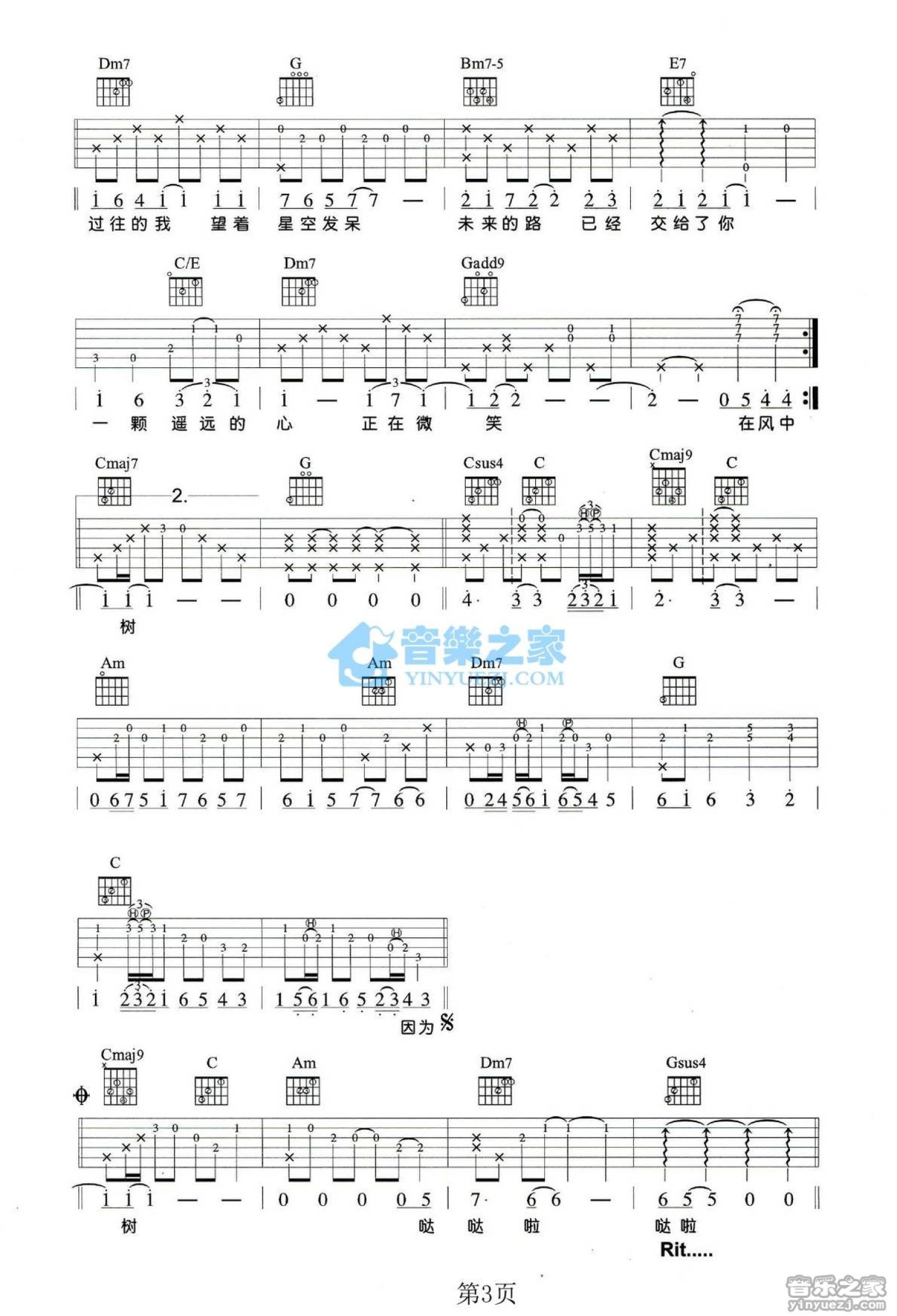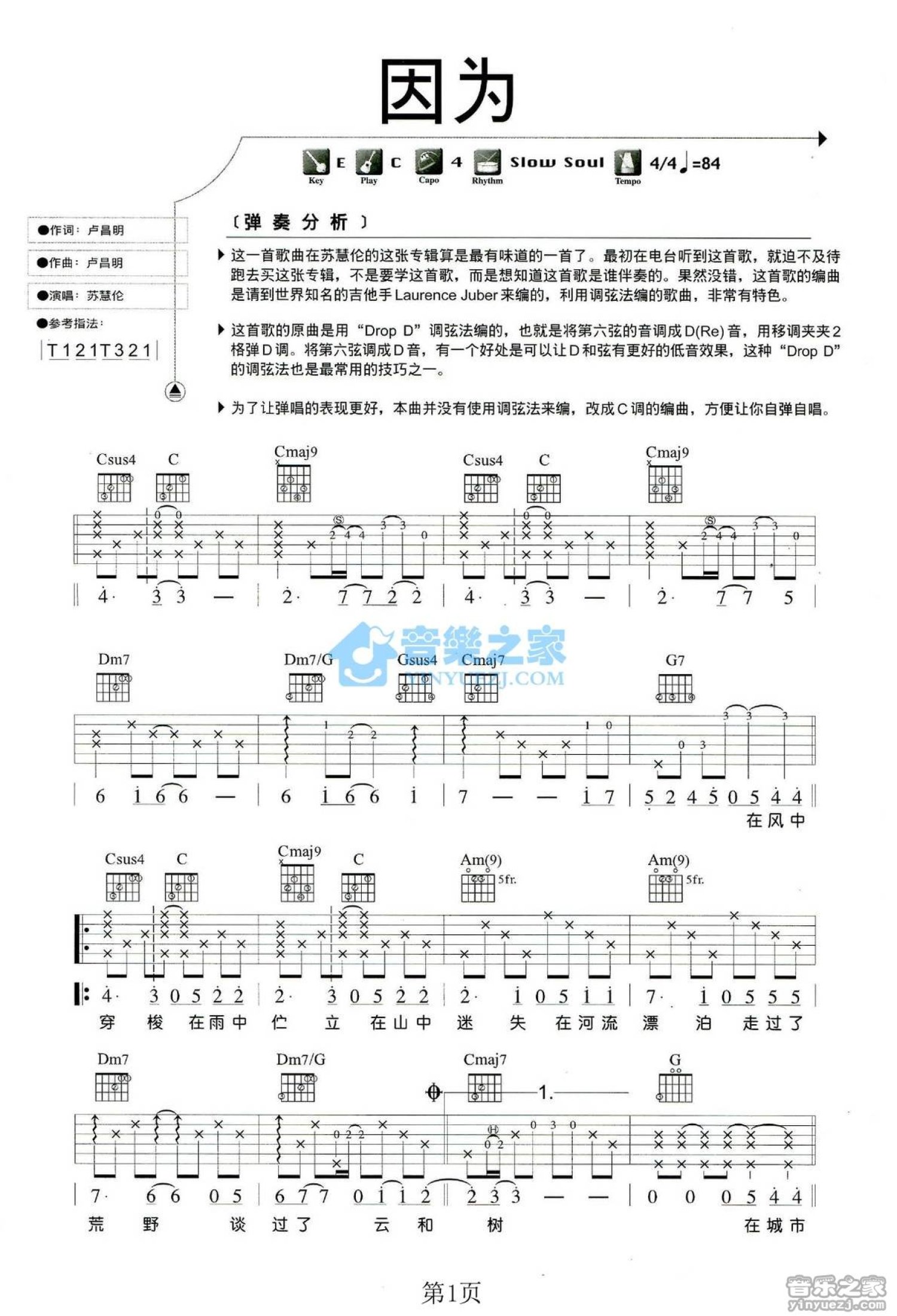 曲谱介绍: C调版 苏慧伦《因为》吉他弹唱六线谱