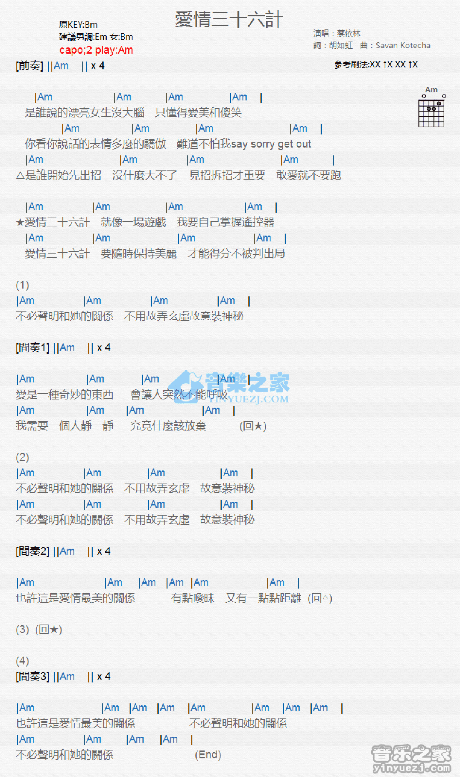 曲谱介绍: Am调版 蔡依林《爱情三十六计》吉他和弦弹唱谱