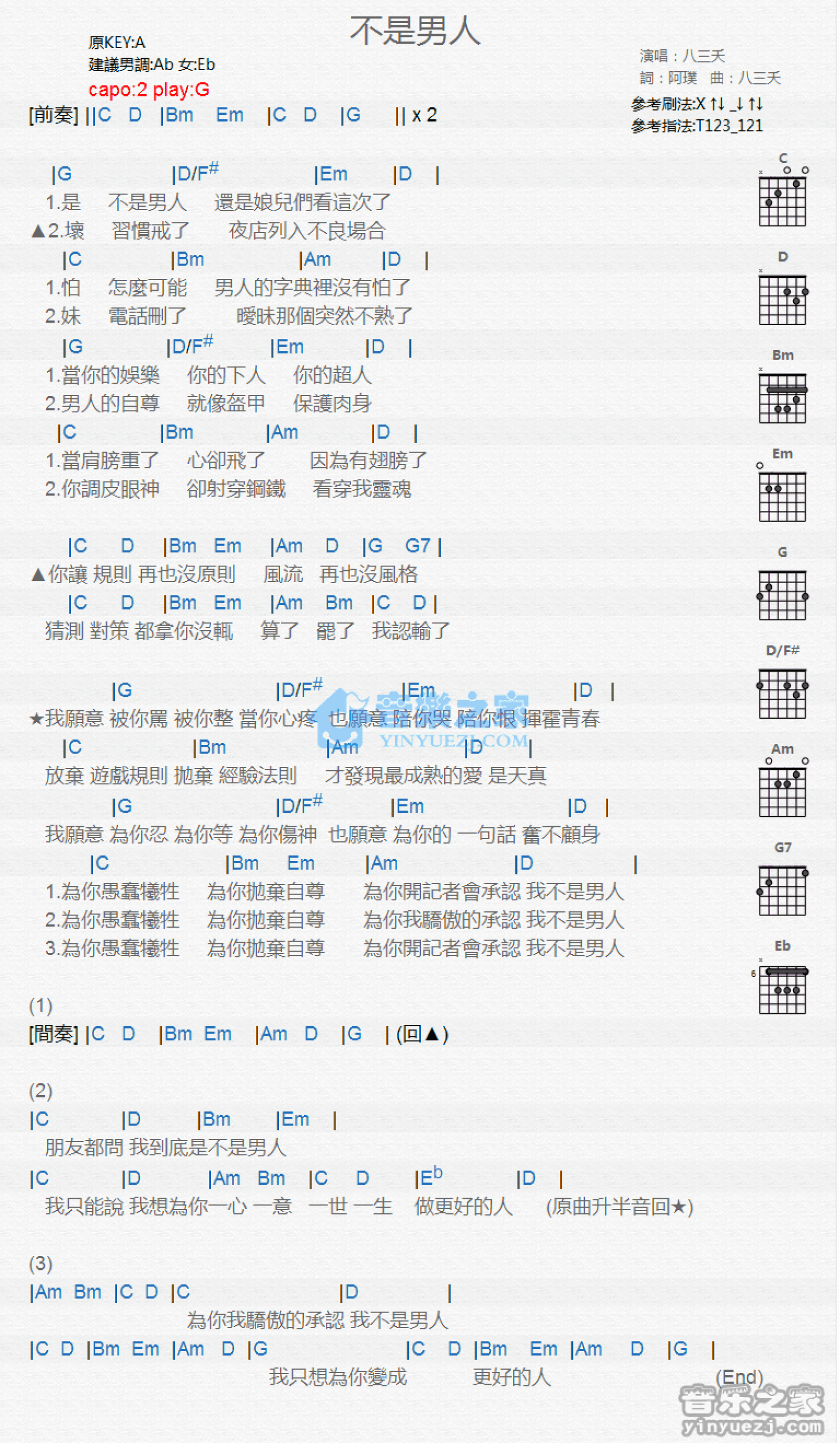 曲谱介绍: G调版 八三夭《不是男人》吉他和弦弹唱谱