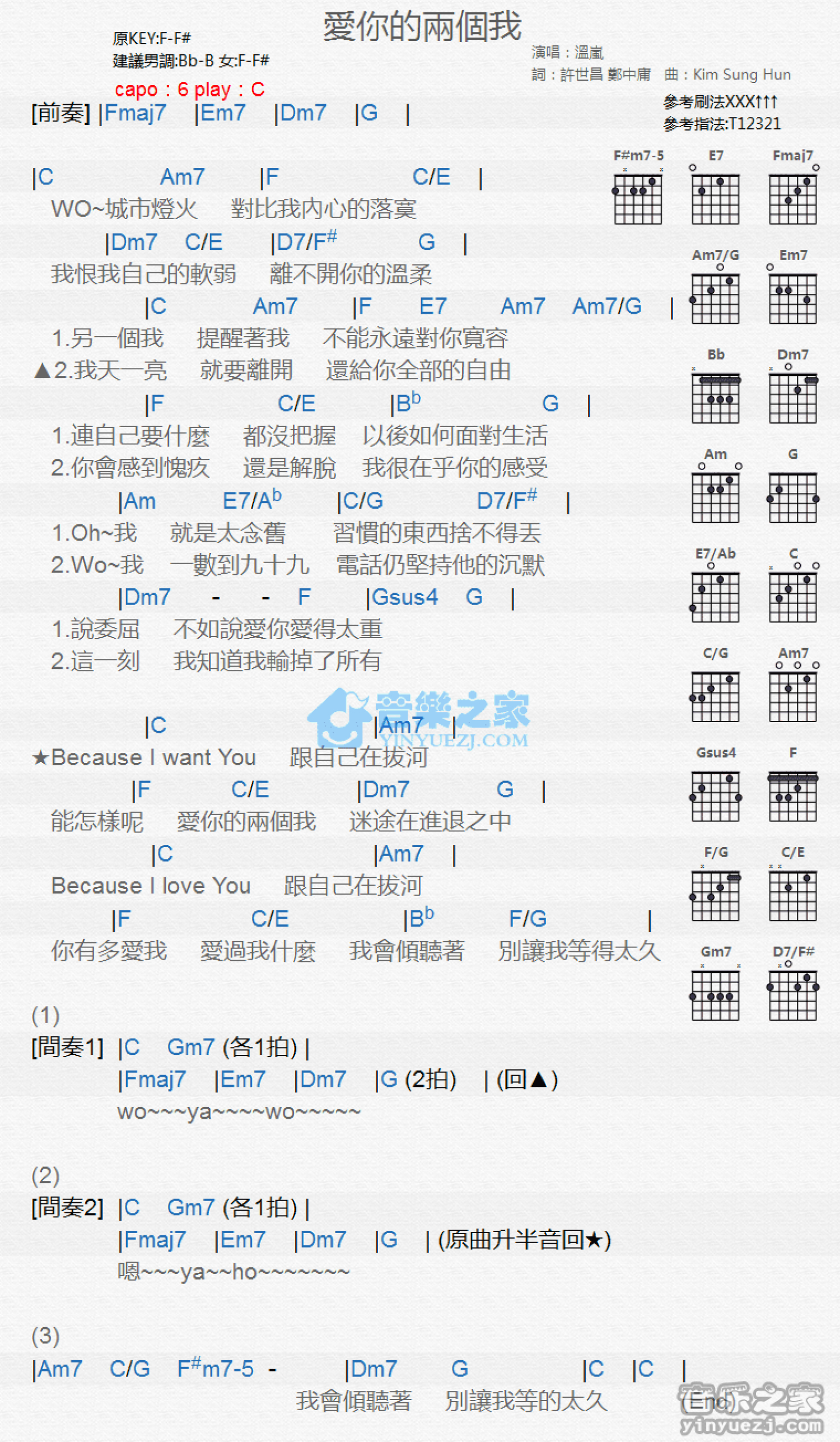 曲谱介绍: C调版 温岚《爱你的两个我》吉他和弦弹唱谱