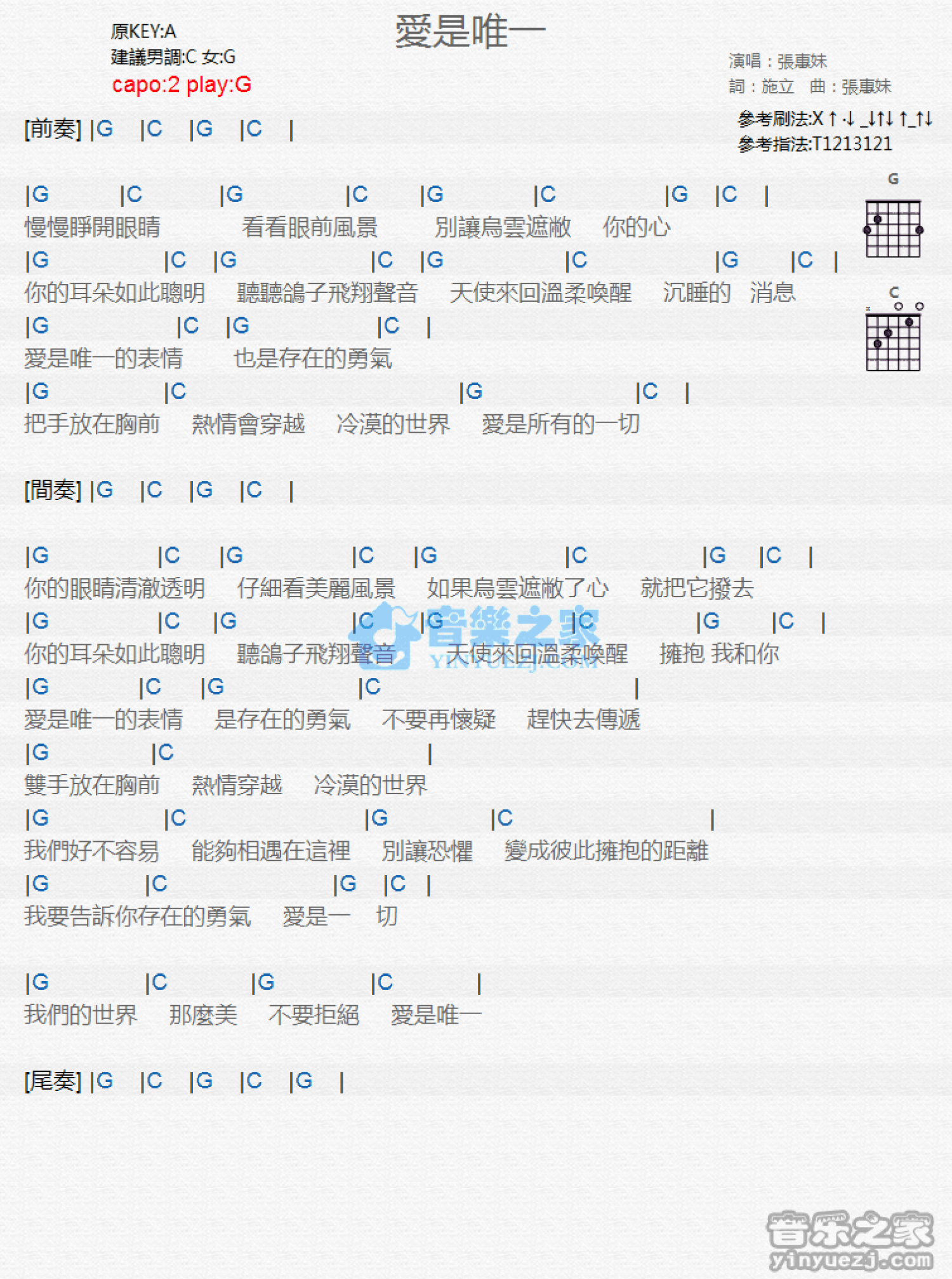 爱是唯一吉他谱 - 张惠妹 - G调吉他弹唱谱 - 和弦谱