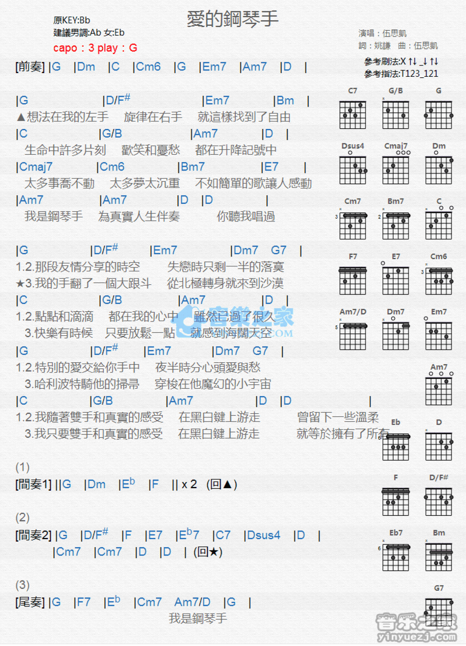 曲谱介绍: G调版 伍思凯《爱的钢琴手》吉他和弦弹唱谱