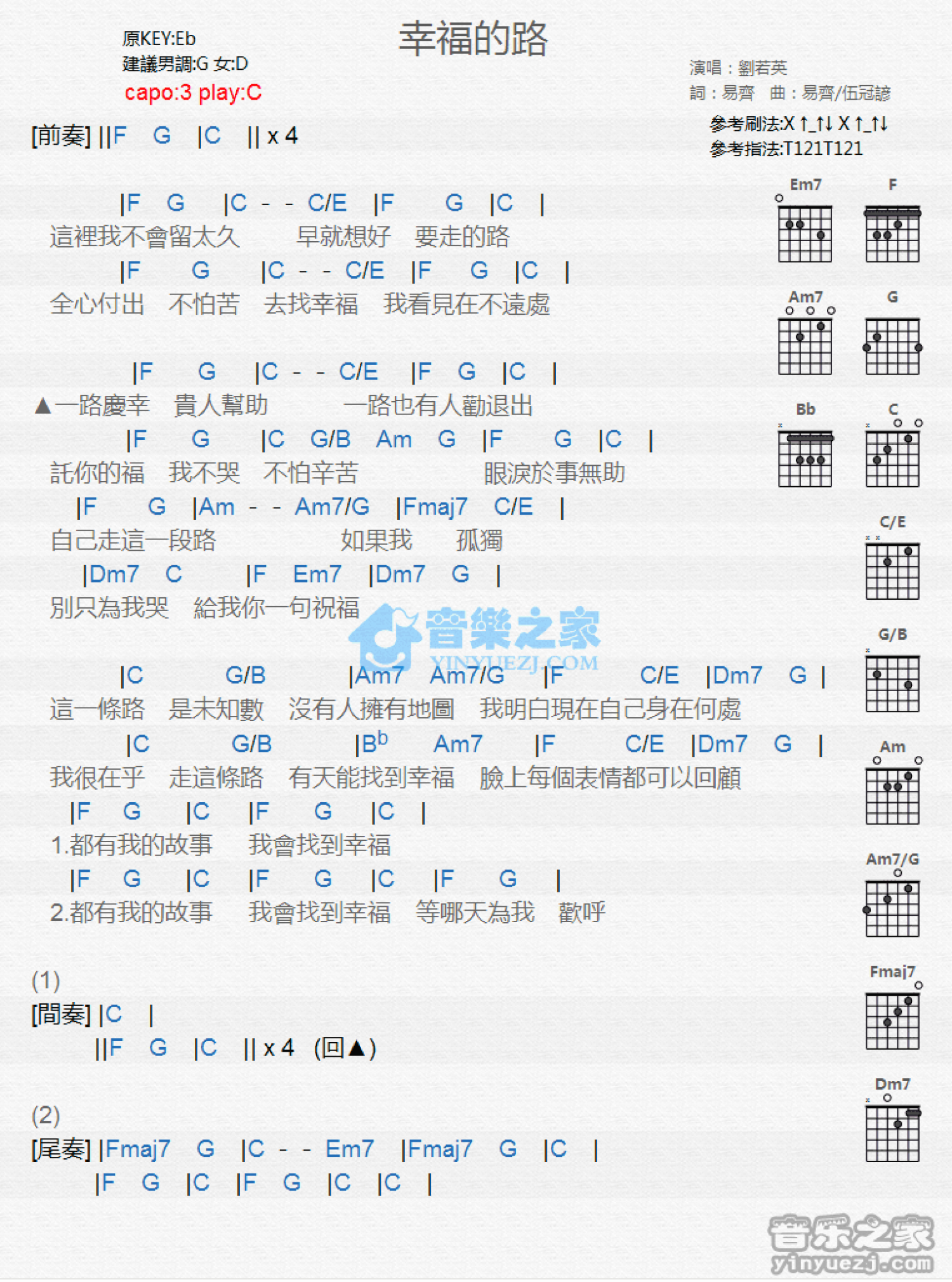 曲谱介绍: C调版 刘若英《幸福的路》吉他和弦弹唱谱