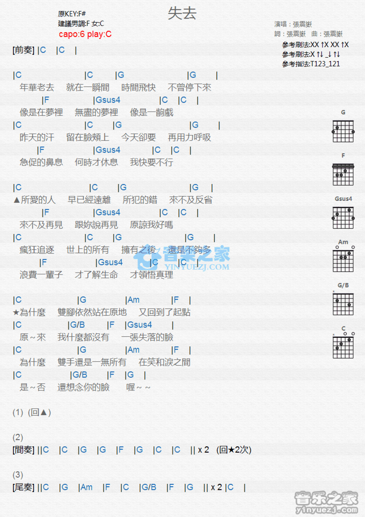 曲谱介绍: C调版《失去》吉他和弦弹唱谱