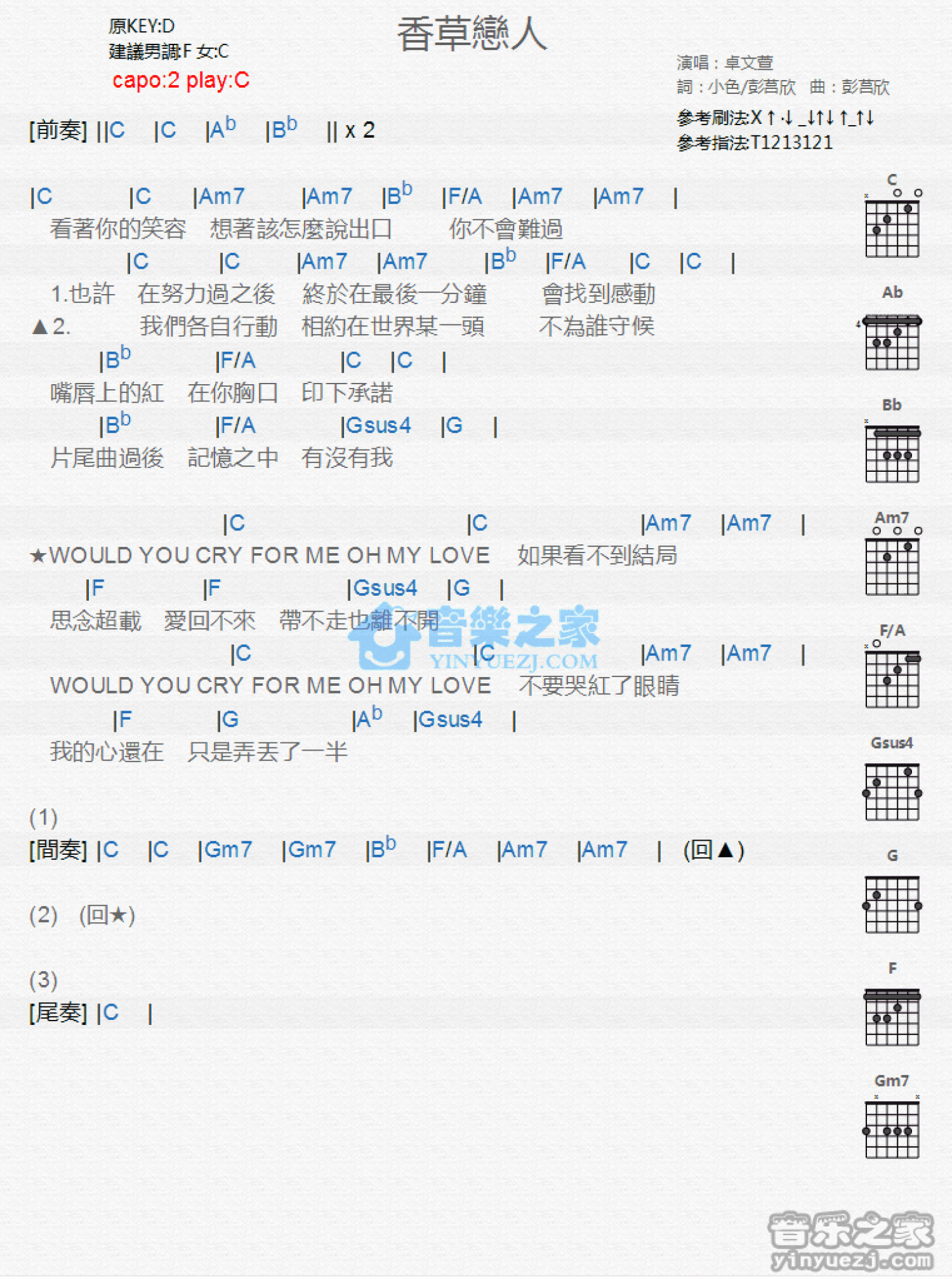 曲谱介绍: C调版 卓文萱《香草恋人》吉他和弦弹唱谱