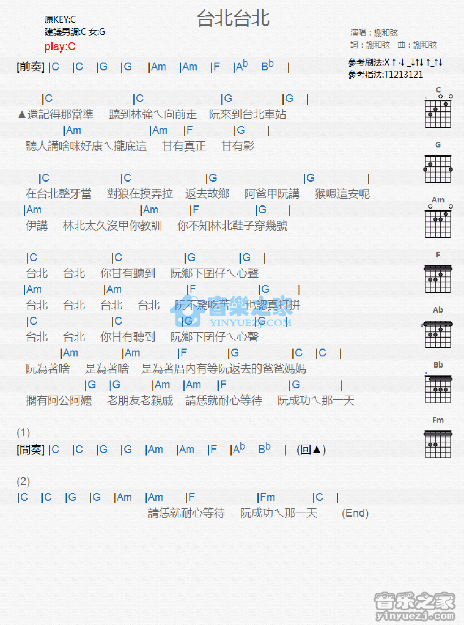 曲谱介绍: C调版 谢和弦《台北台北》吉他和弦弹唱谱