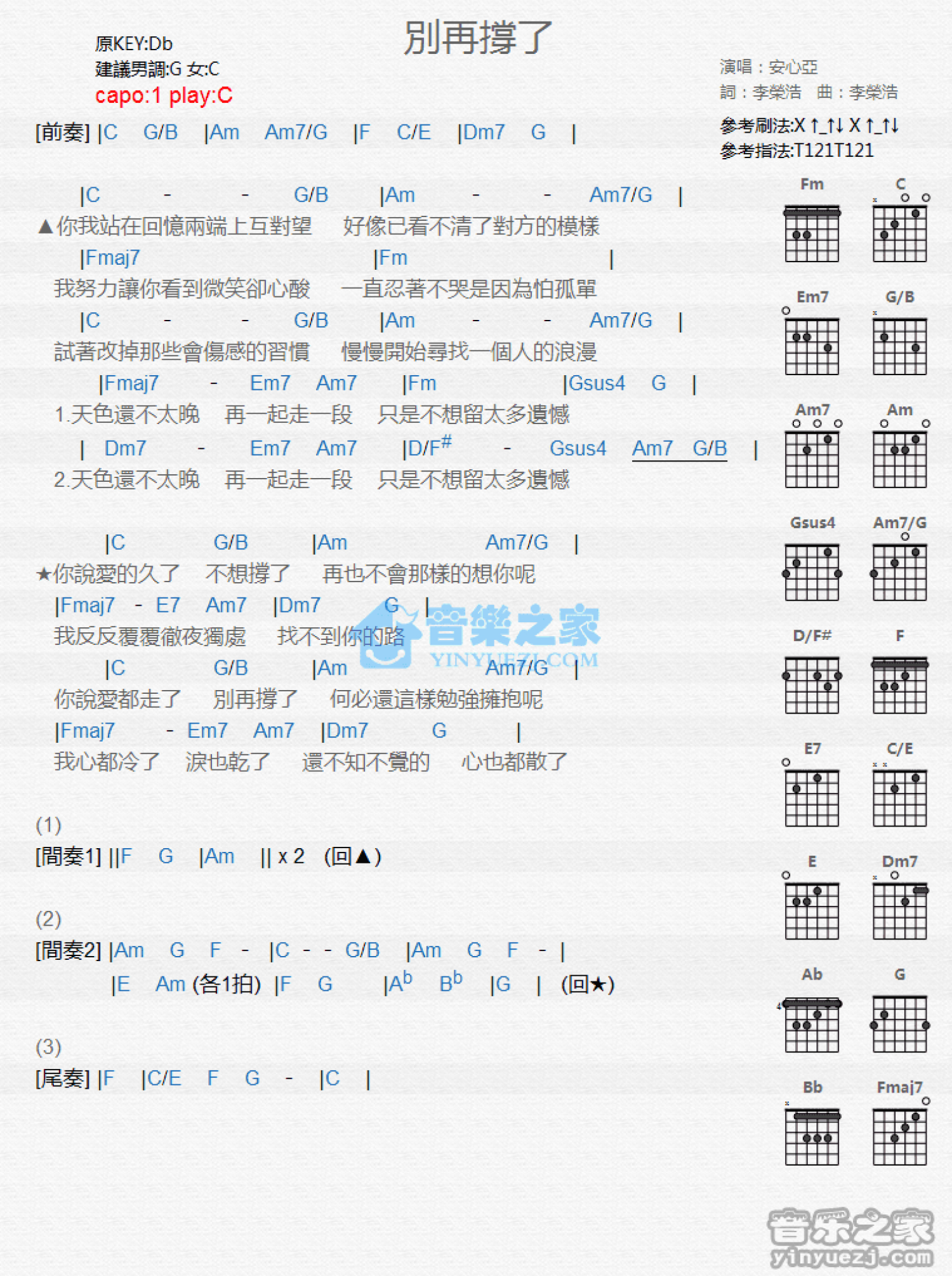 曲谱介绍: C调版 安心亚《别再撑了》吉他和弦弹唱谱