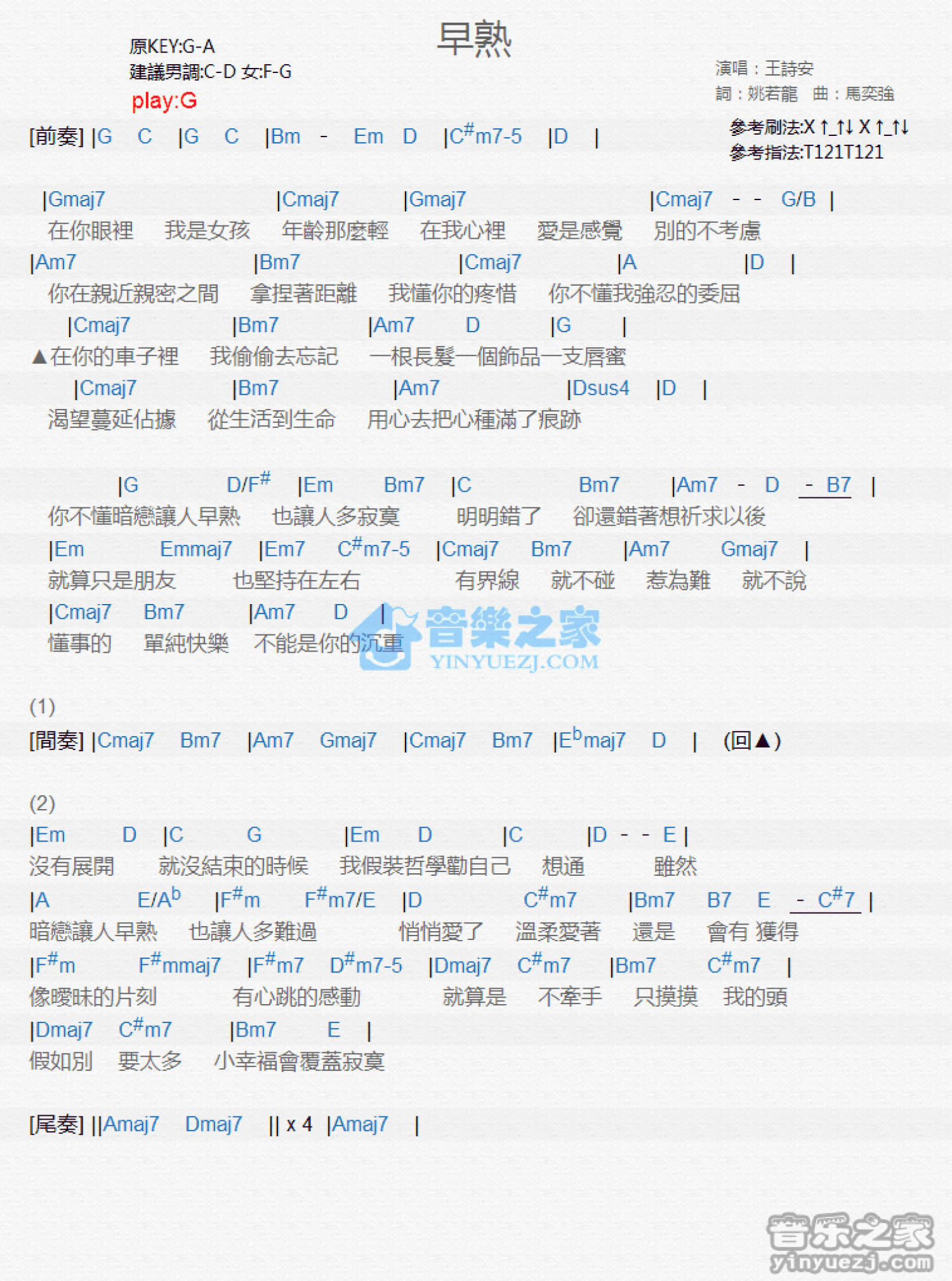 曲谱介绍: G调版 王诗安《早熟》吉他和弦弹唱谱