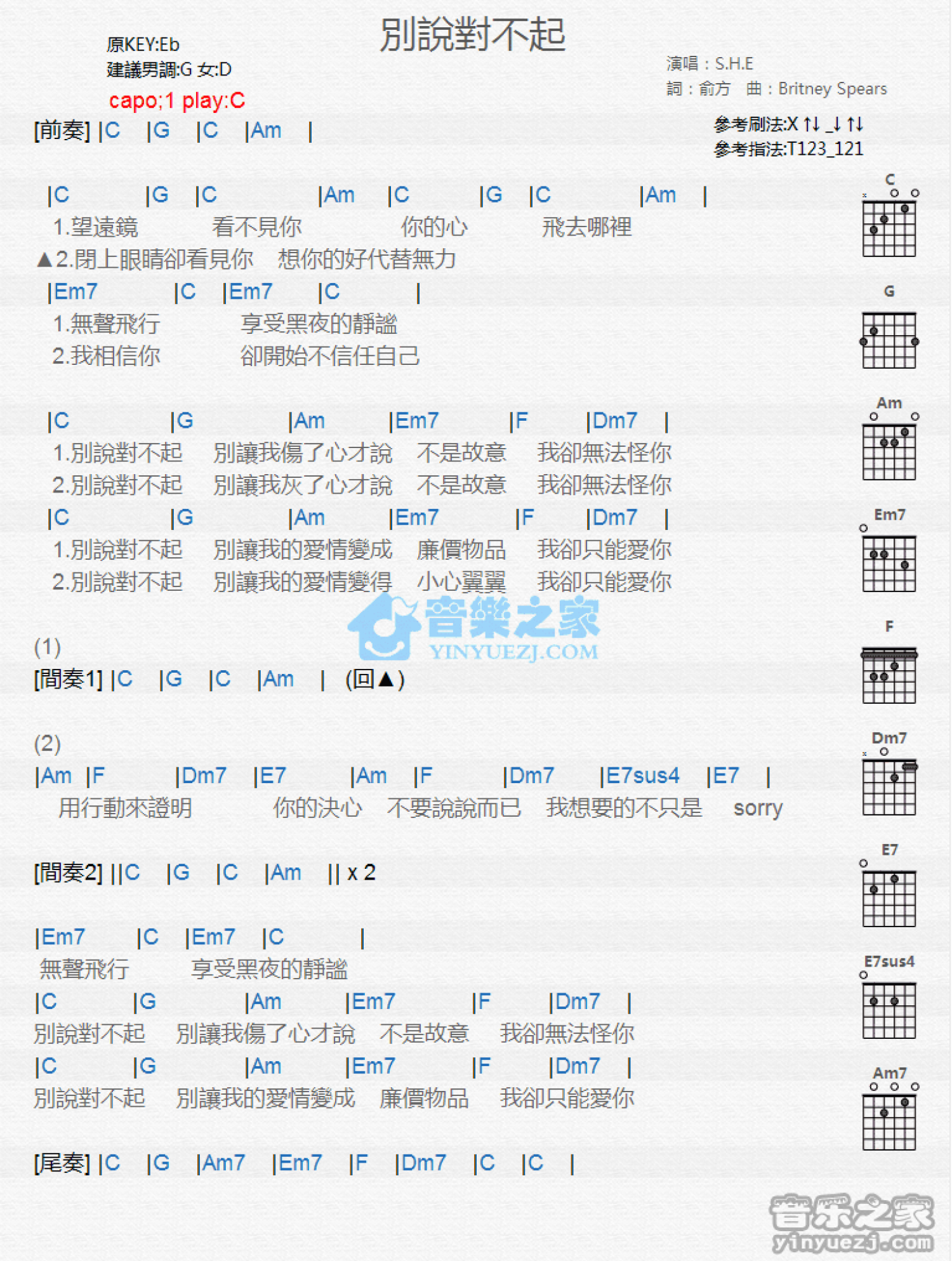 别说对不起吉他谱 - S.H.E - C调吉他弹唱谱 - 和弦谱