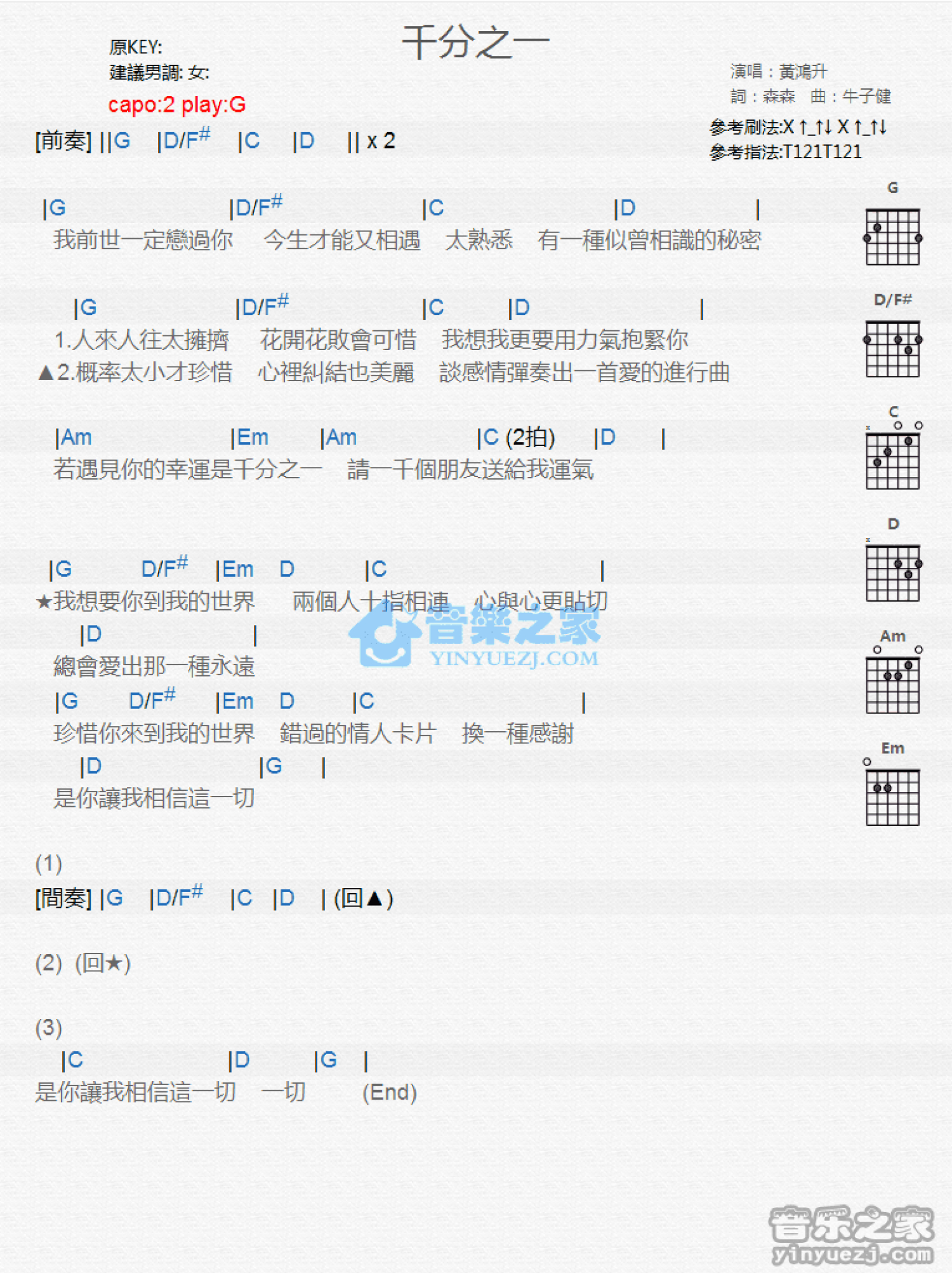曲谱介绍: G调版 黄鸿升《千分之一》吉他和弦弹唱谱