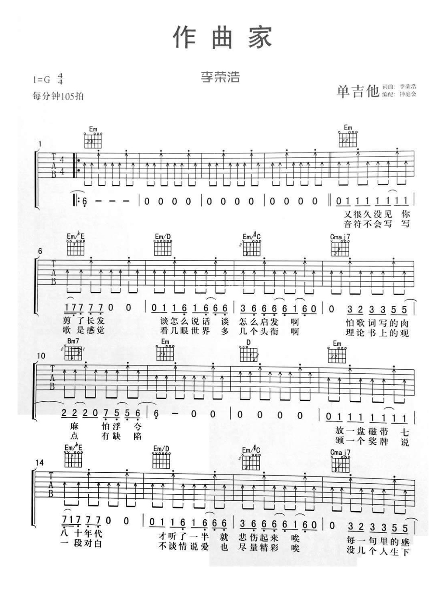 作曲家吉他谱 - 李荣浩 - G调吉他弹唱谱