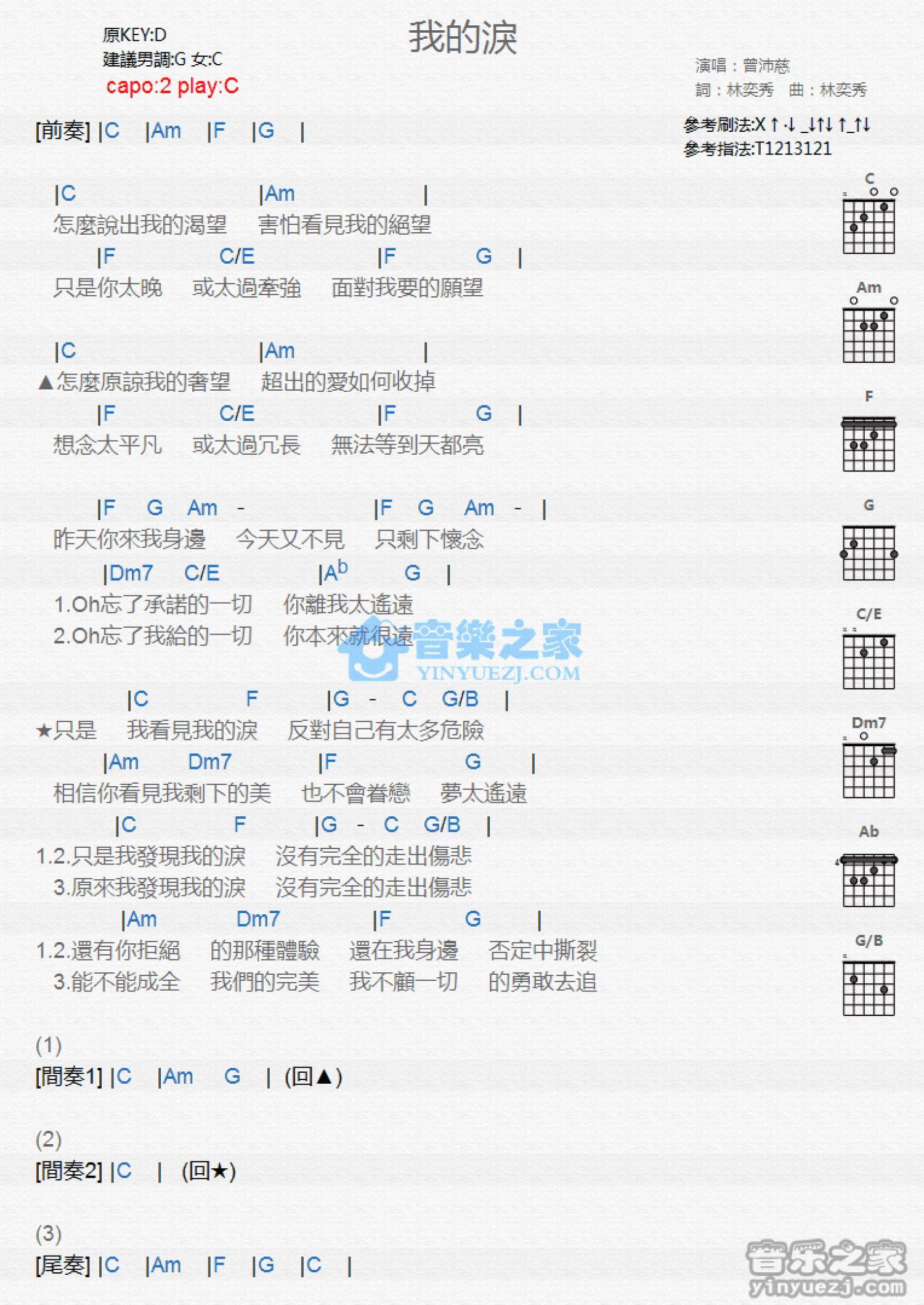 曲谱介绍: C调版 曾沛慈《我的泪》吉他和弦弹唱谱