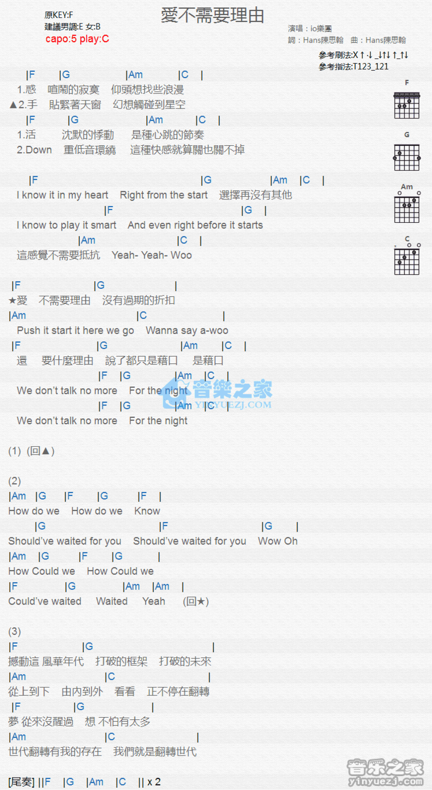 曲谱介绍: C调版 IO乐团《爱不需要理由》吉他和弦弹唱谱