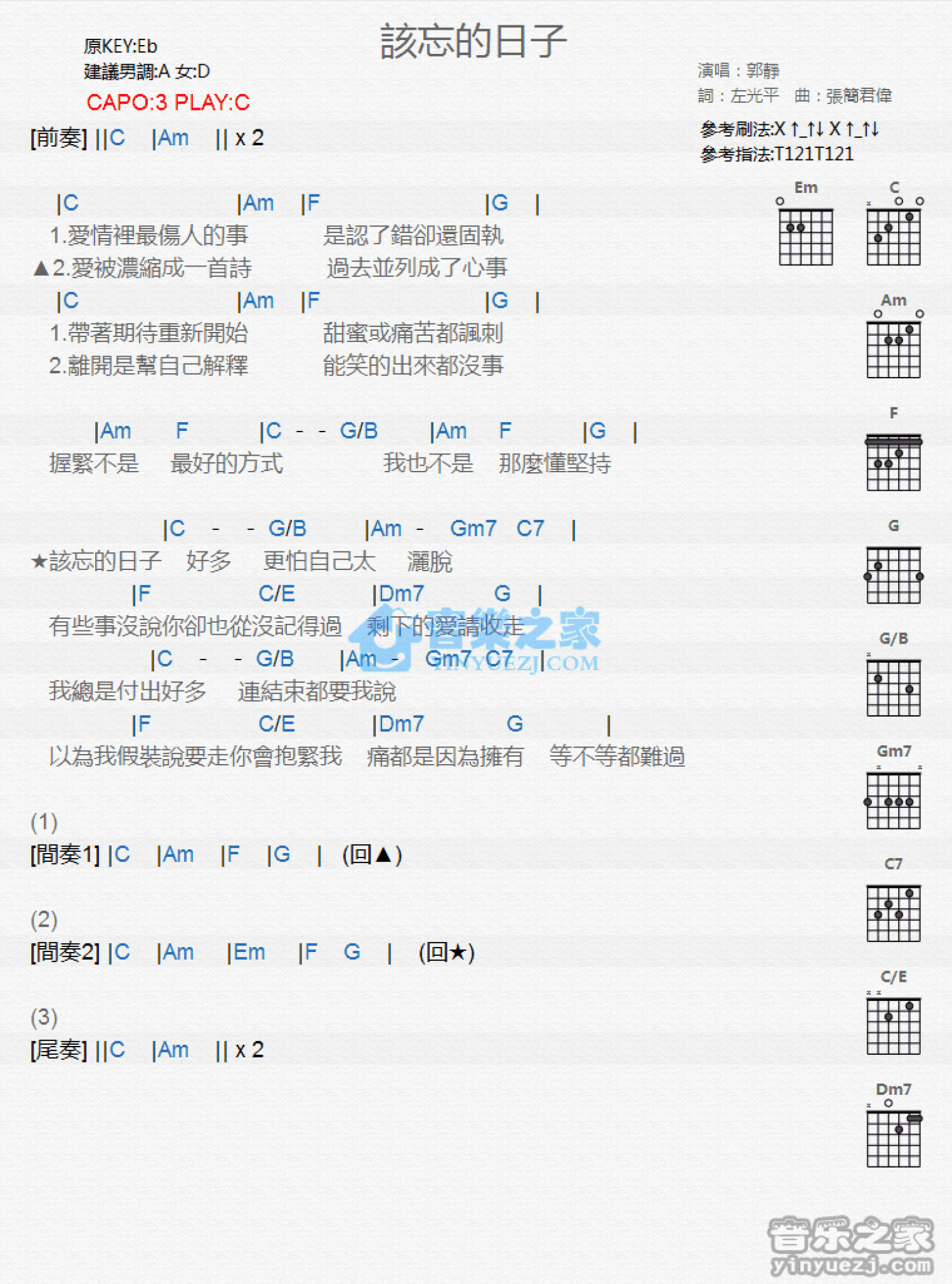 曲谱介绍: C调版 郭静《该忘的日子》吉他和弦弹唱谱