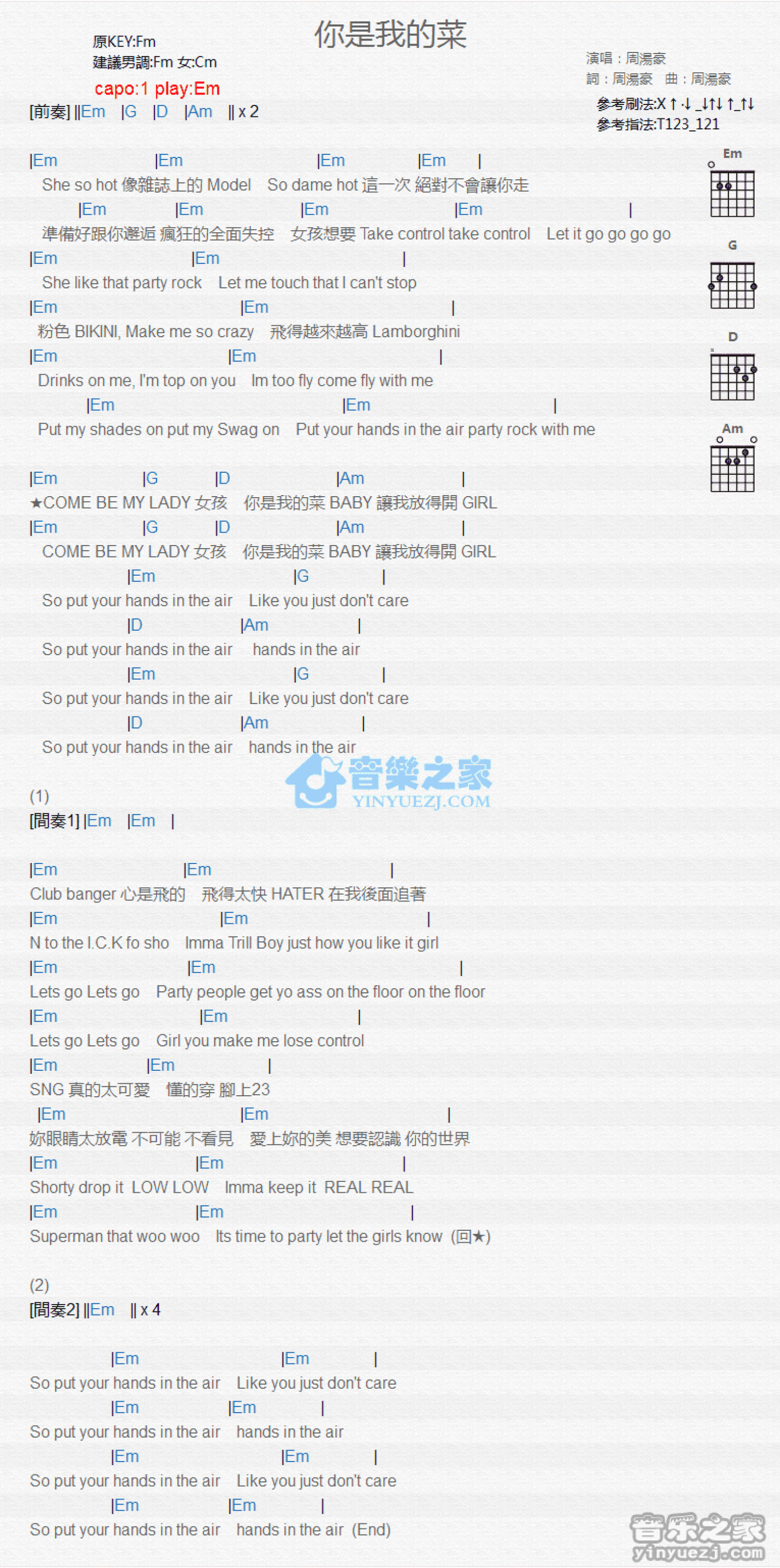 曲谱介绍: Em调版 周汤豪《你是我的菜》吉他和弦弹唱谱