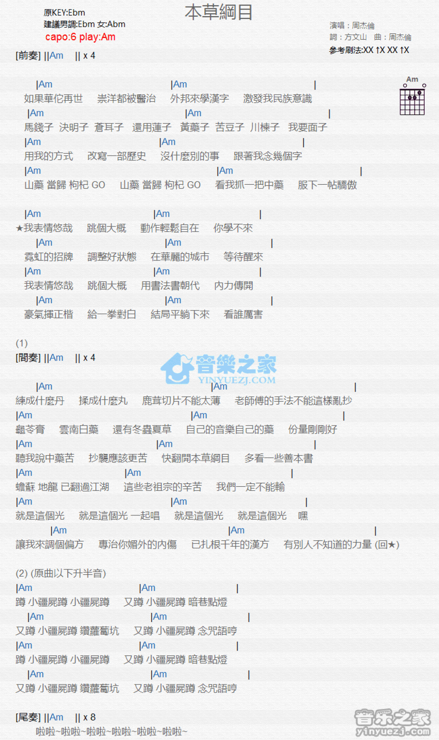 曲谱介绍: Am调版 周杰伦《本草纲目》吉他和弦弹唱谱