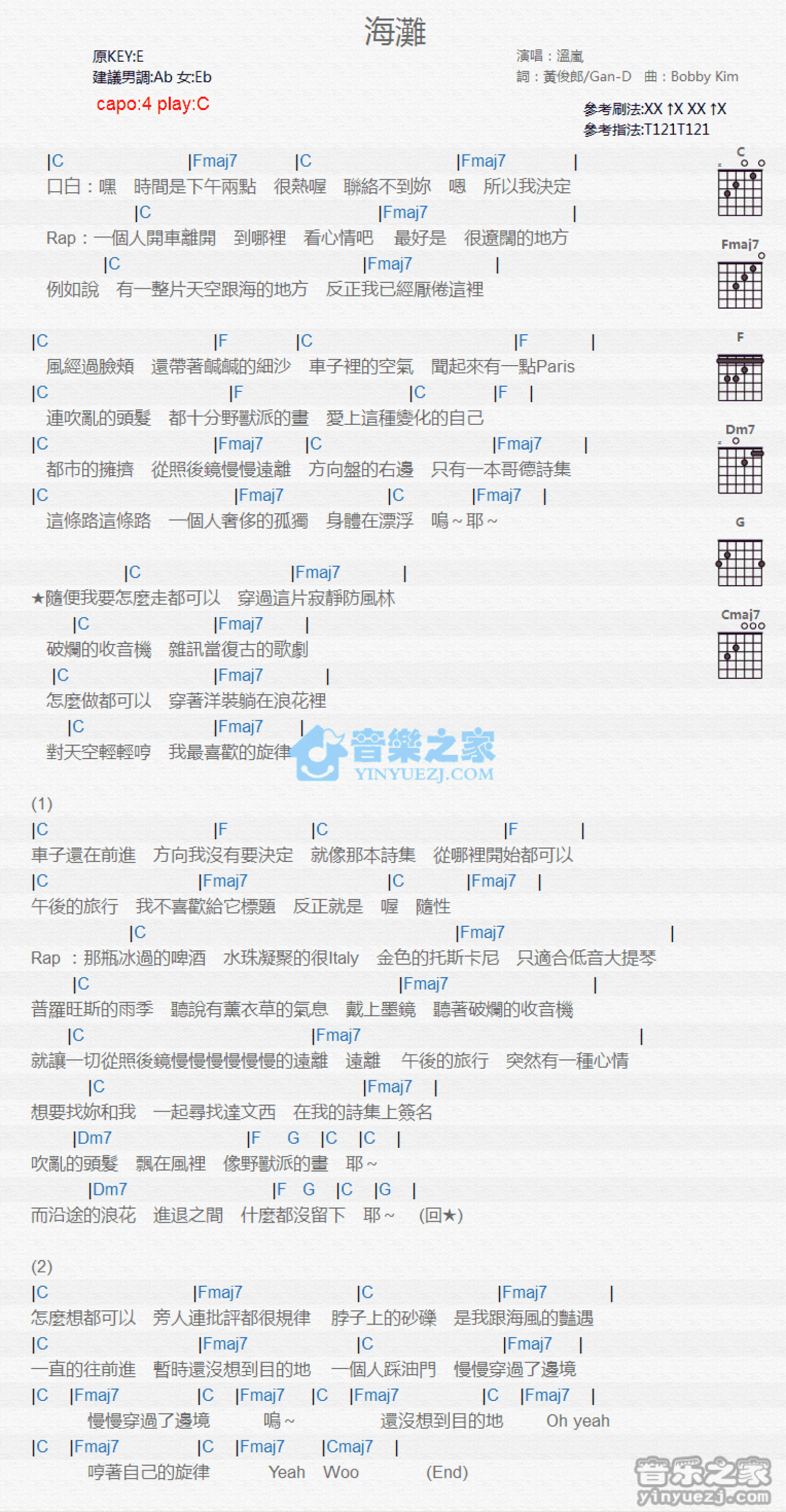 曲谱介绍: C调版 温岚《海滩》吉他和弦弹唱谱