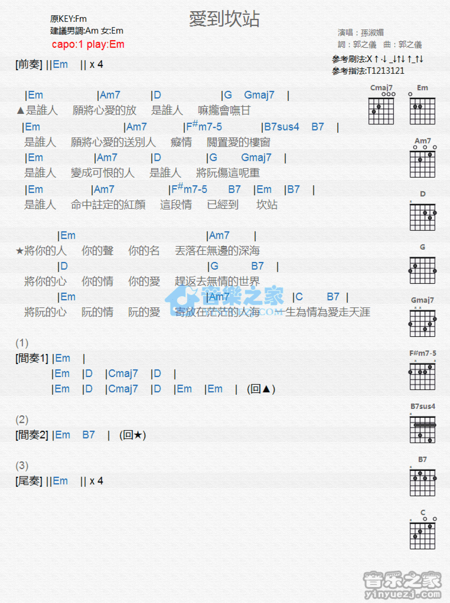 曲谱介绍: Em调版 孙淑媚《爱到坎站》吉他和弦弹唱谱