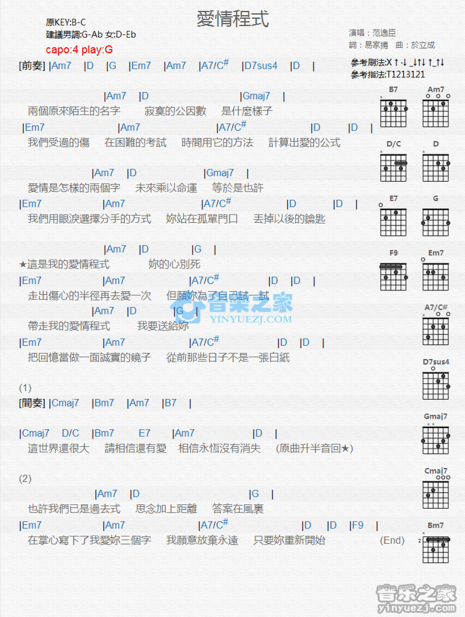 曲谱介绍: G调版 范逸臣《爱情程式》吉他和弦弹唱谱