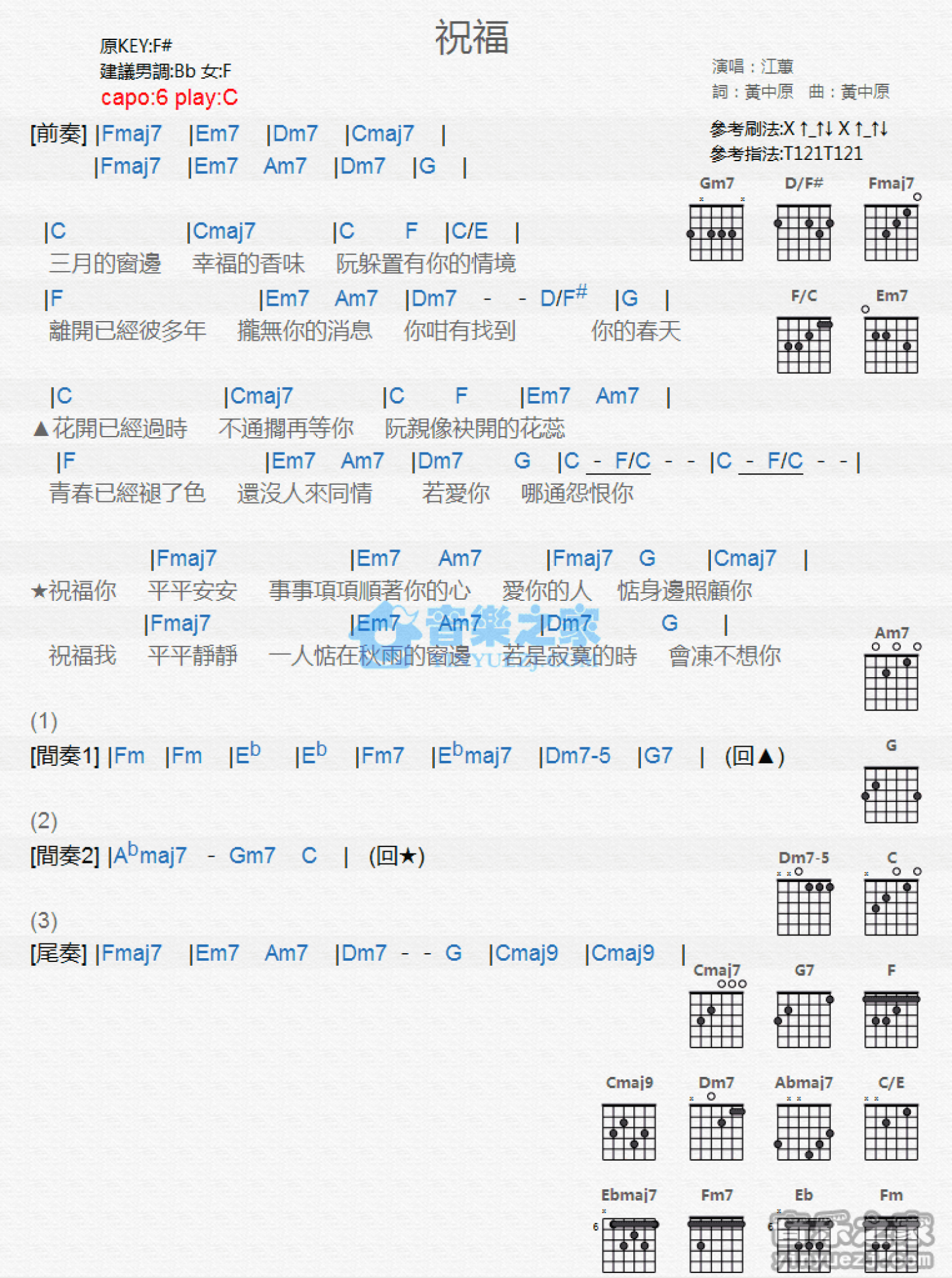 曲谱介绍: C调版 江蕙《祝福》吉他和弦弹唱谱
