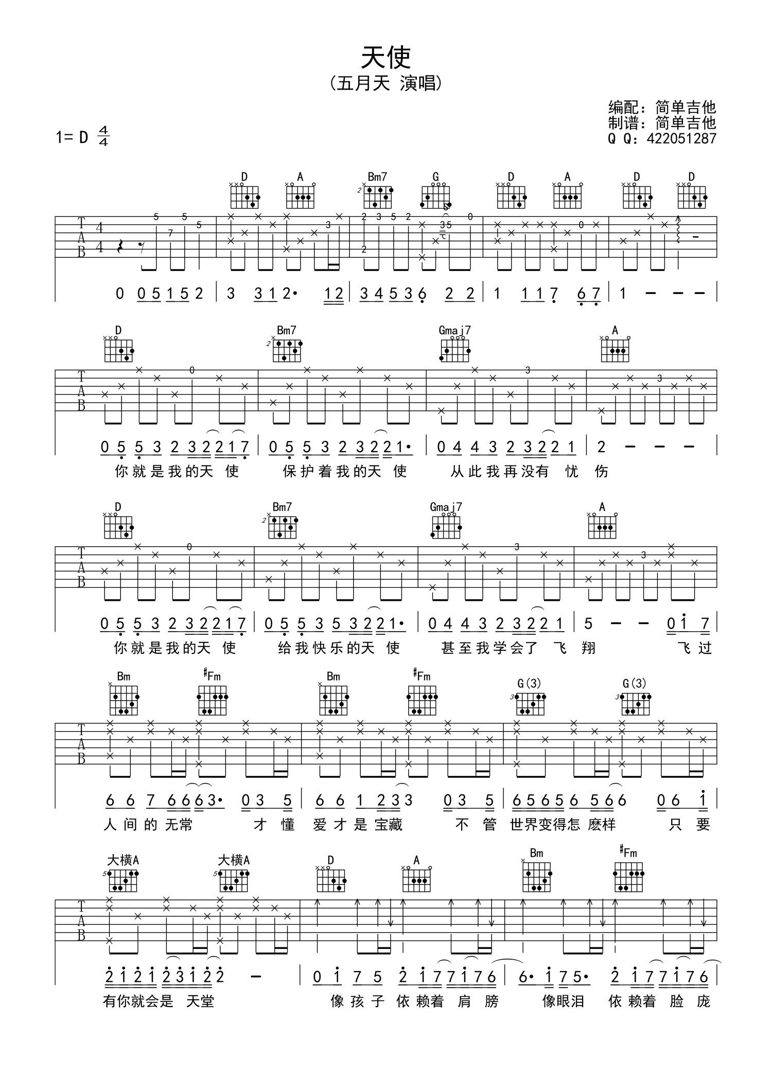 曲谱介绍: 五月天《天使》吉他谱_D调吉他弹唱谱