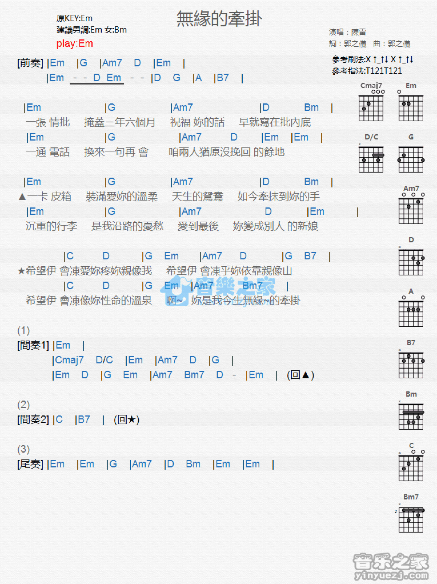曲谱介绍: Em调版《无缘的牵挂》吉他和弦弹唱谱