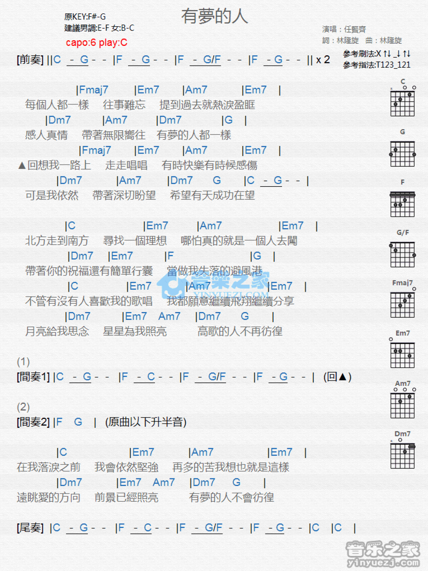 曲谱介绍: C调版 任贤齐《有梦的人》吉他和弦弹唱谱