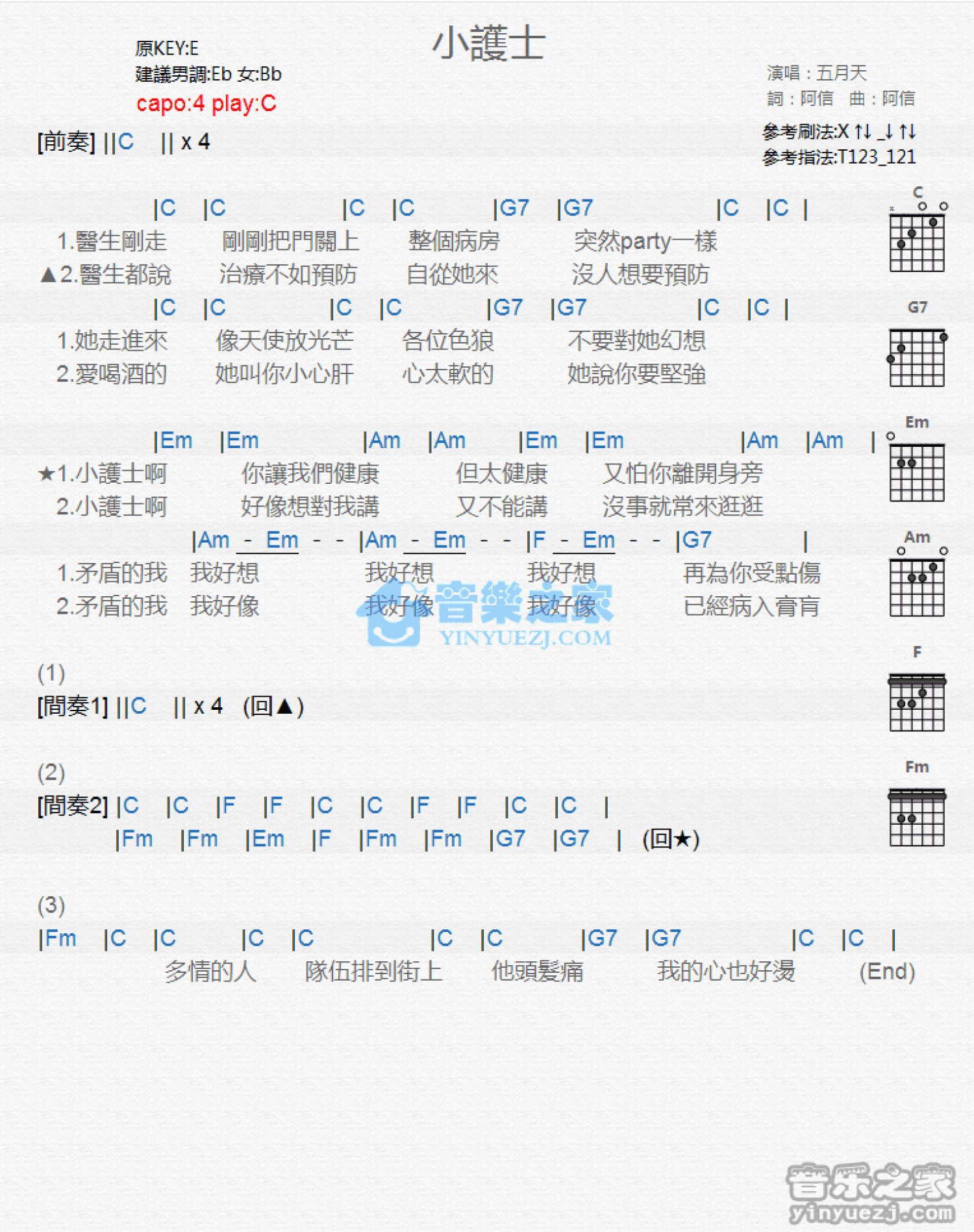 曲谱介绍: C调版 五月天《小护士》吉他和弦弹唱谱