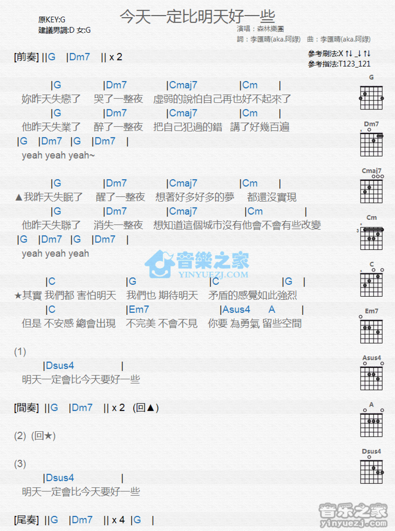 曲谱介绍: 森林乐团《明天一定会比今天更好一些》吉他和弦弹唱谱