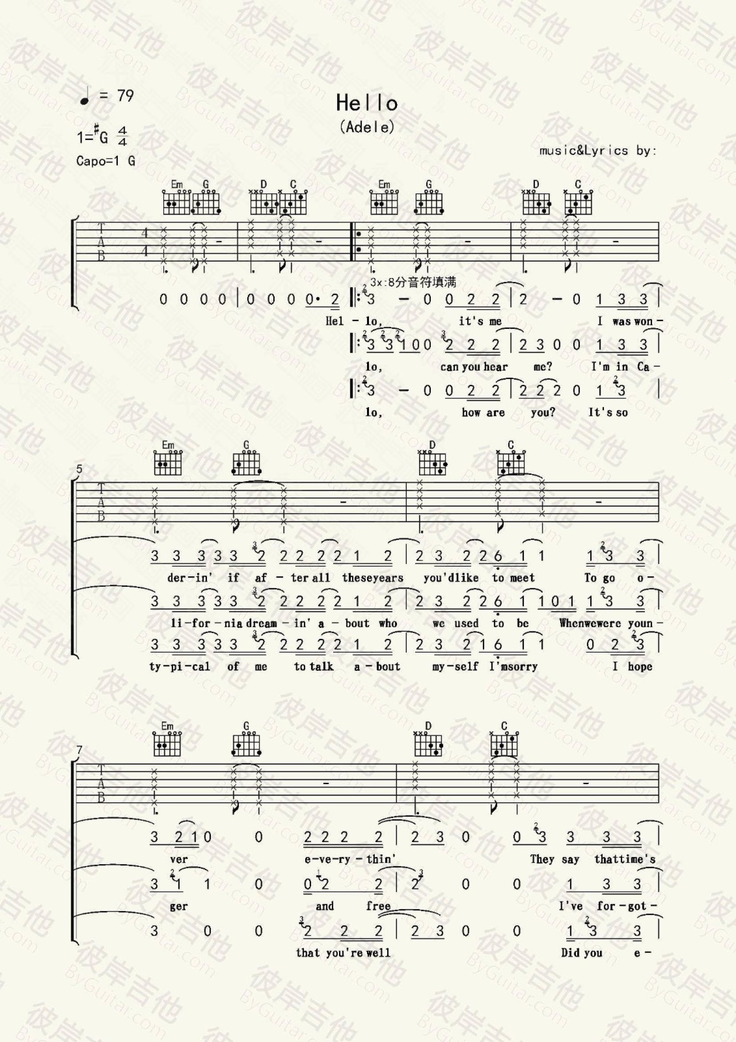 曲谱介绍: AdeleHello吉他谱,歌曲原调升G调,选用G调指法,变调夹夹一品。阿黛尔的这首《你好》整首歌曲用到的几个和弦比较简单,编辑曲谱加了一些拍板的用法,节奏方面配合弹唱会有一些难度,琴友们需要多加练习。