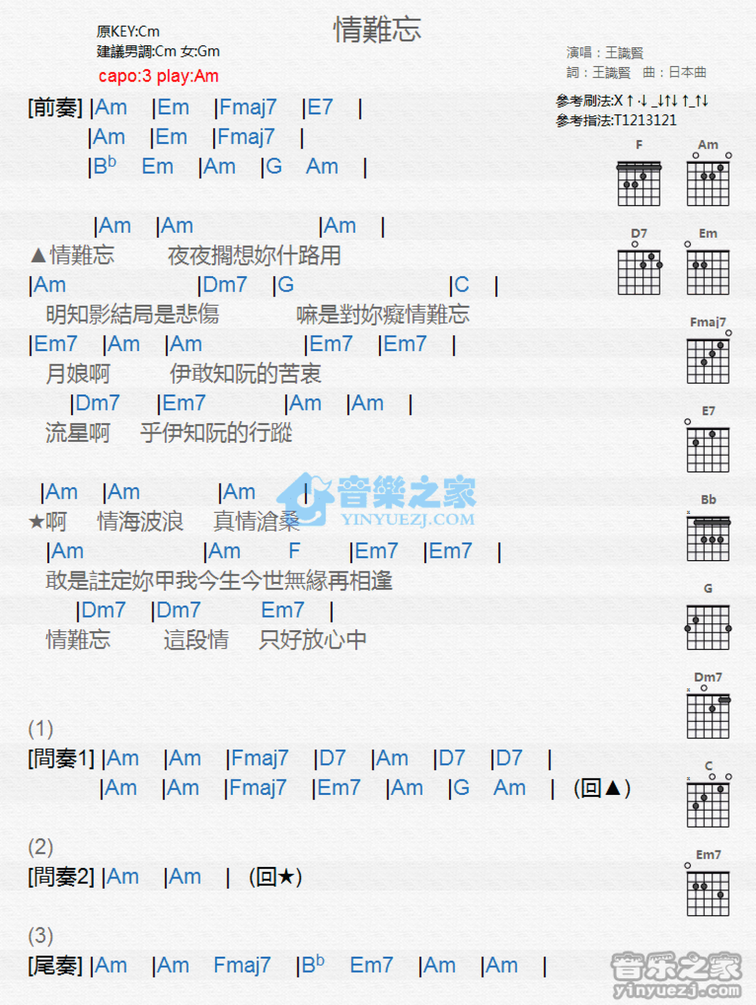 曲谱介绍: Am调版 王识贤《情难忘》吉他和弦弹唱谱