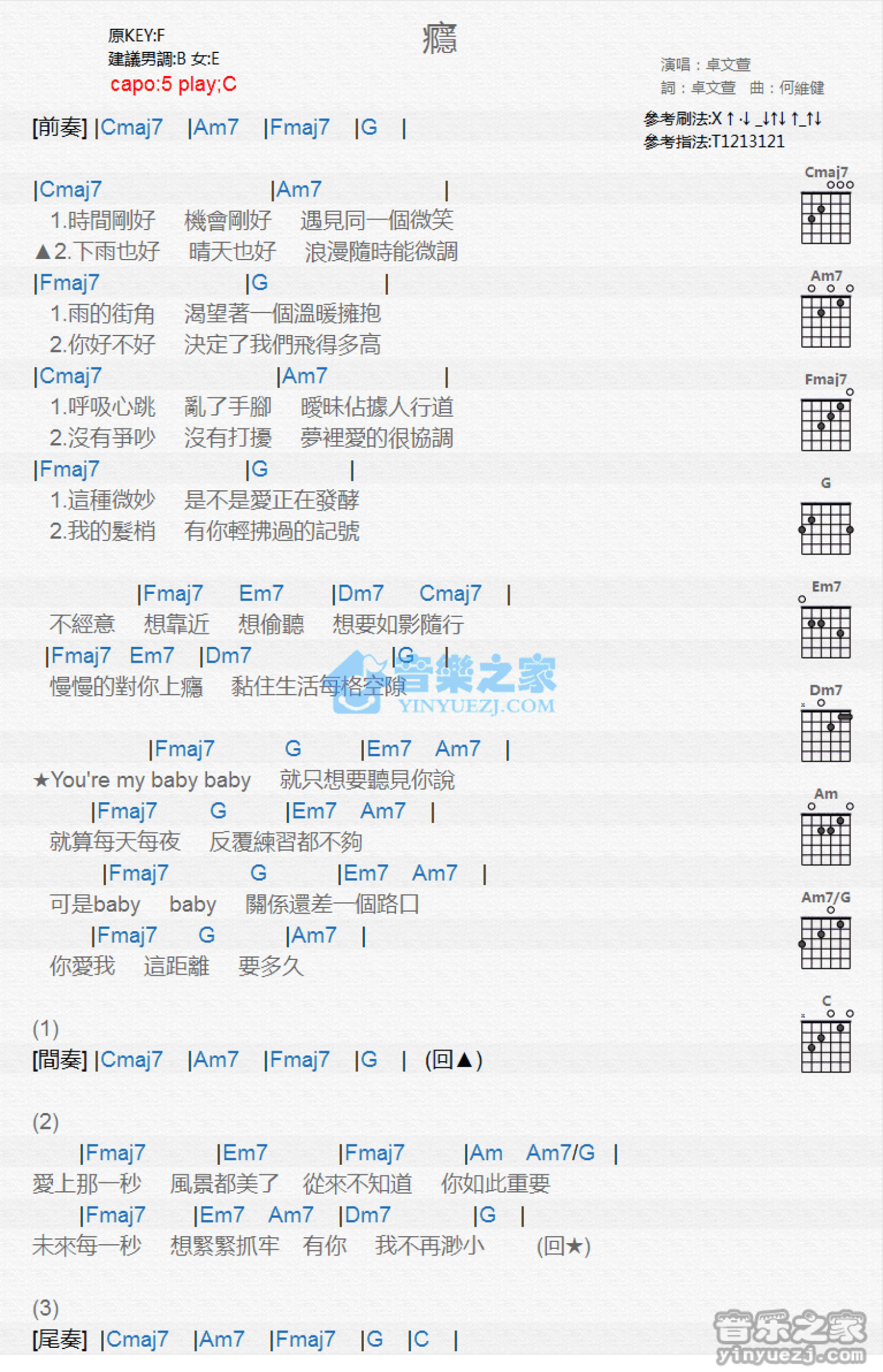 瘾吉他谱 - 卓文萱 - C调吉他弹唱谱 - 和弦谱