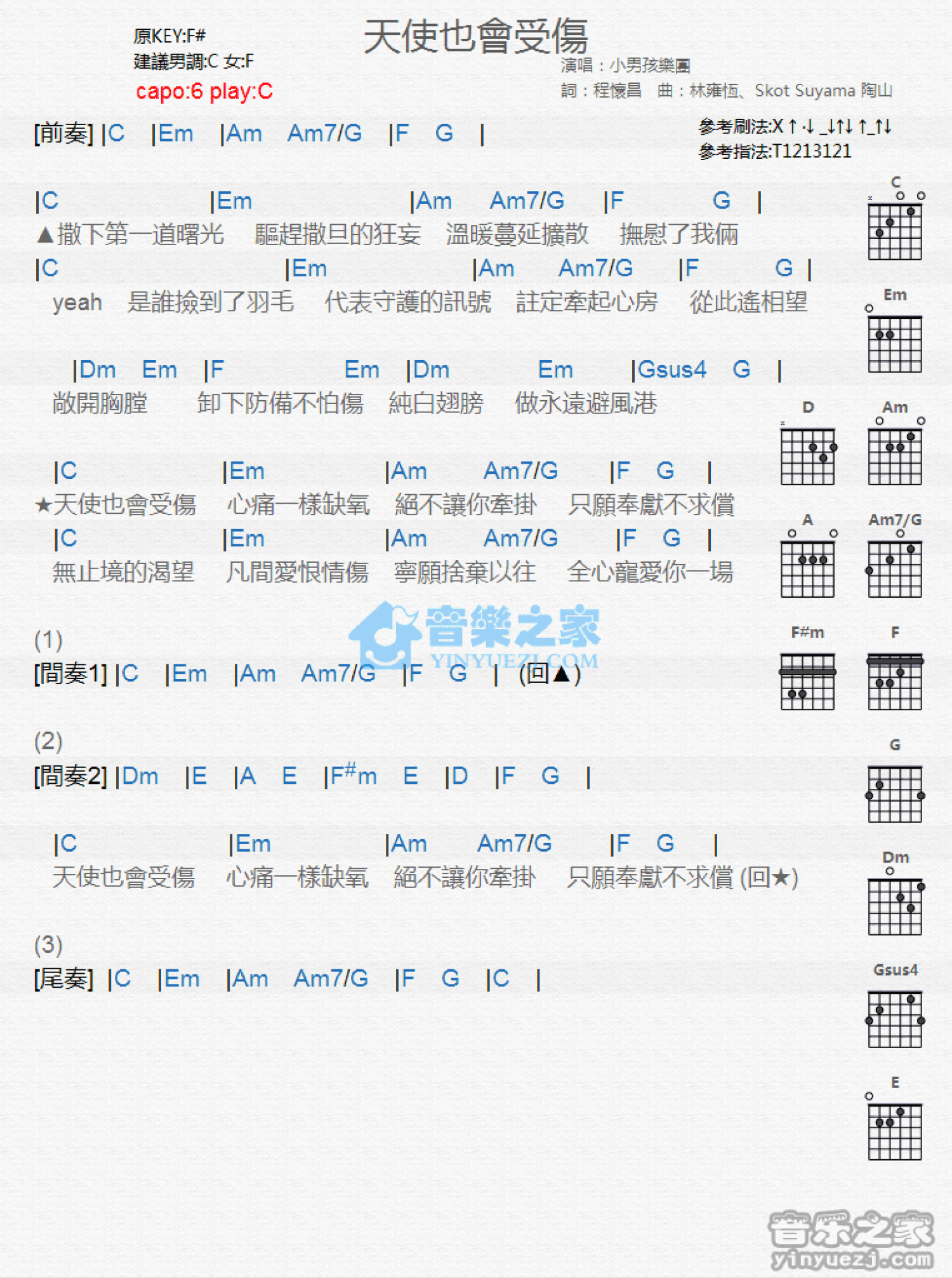曲谱介绍: C调版 小男孩乐团《天使也会受伤》吉他和弦弹唱谱