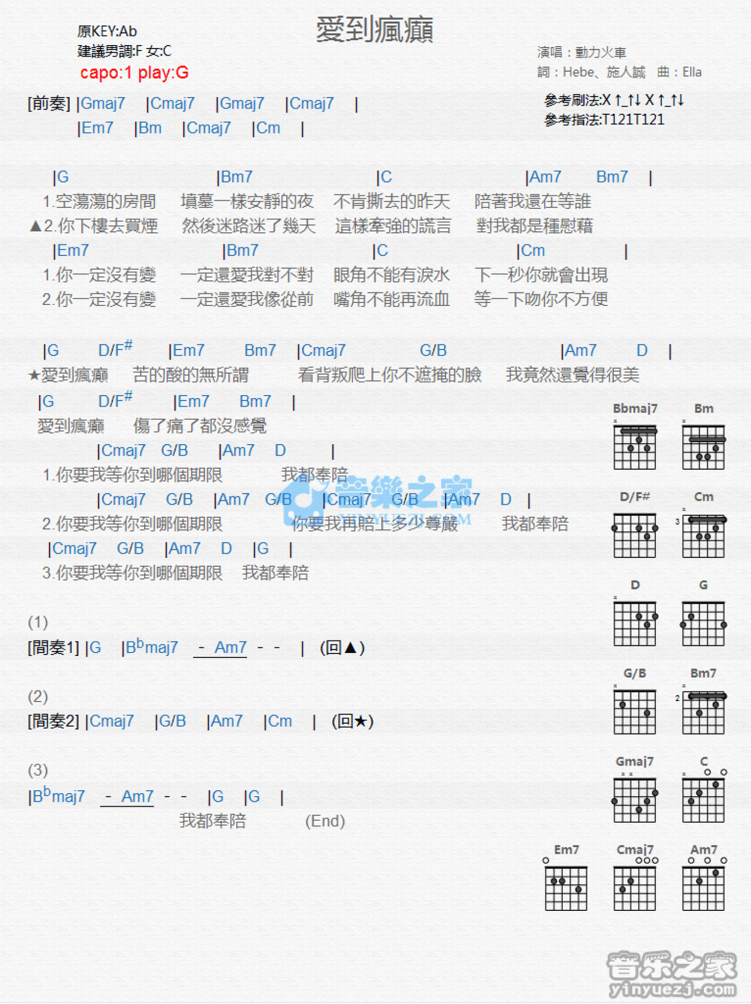 曲谱介绍: G调版 动力火车《爱到疯癫》吉他和弦弹唱谱