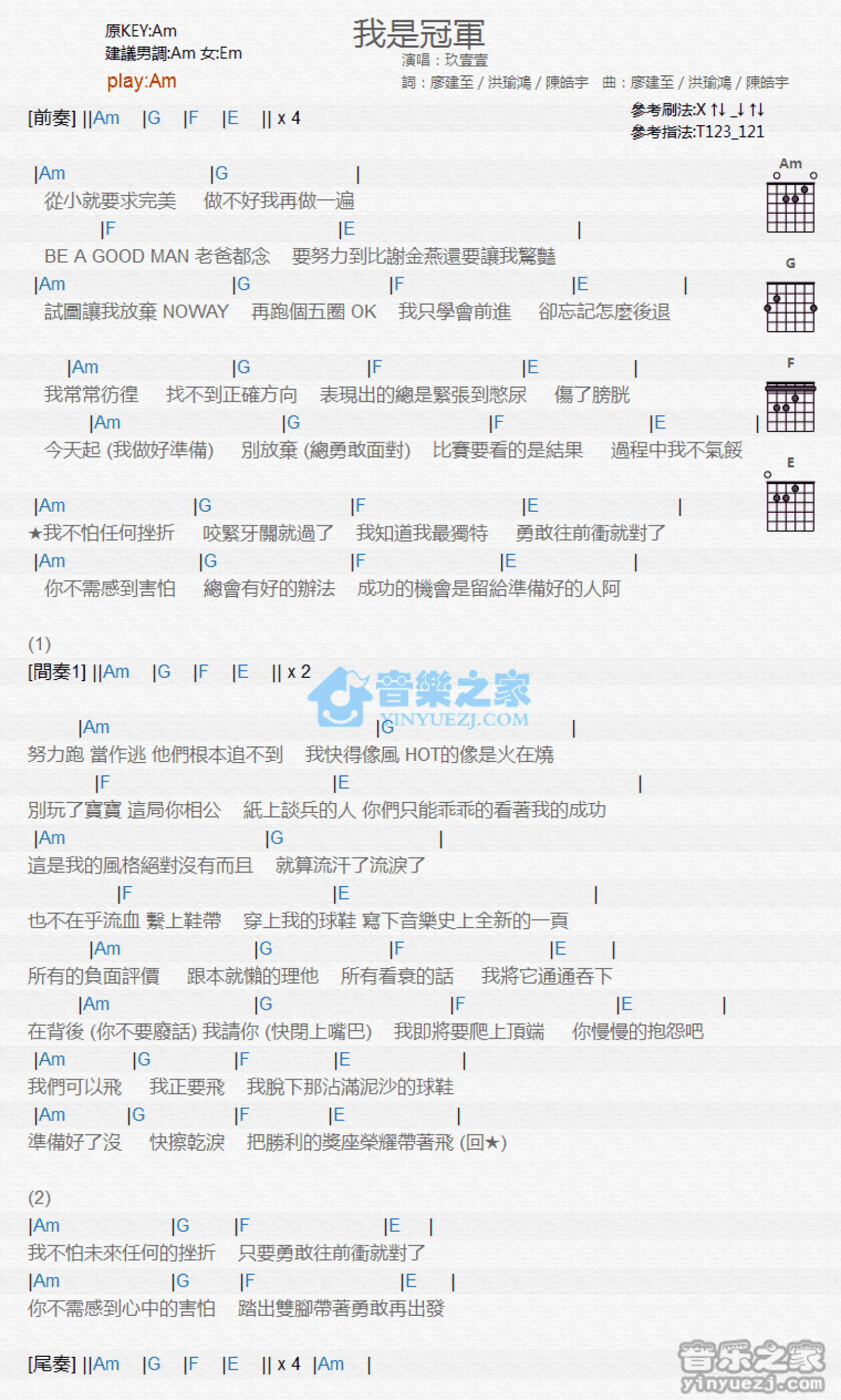 曲谱介绍: Am调版 玖壹壹《我是冠军》吉他和弦弹唱谱