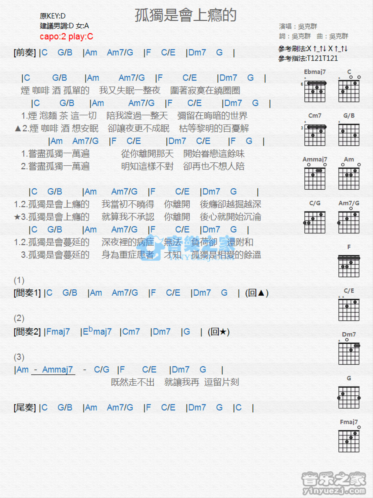 曲谱介绍: C调版 吴克t《孤独是会上瘾的》吉他和弦弹唱谱