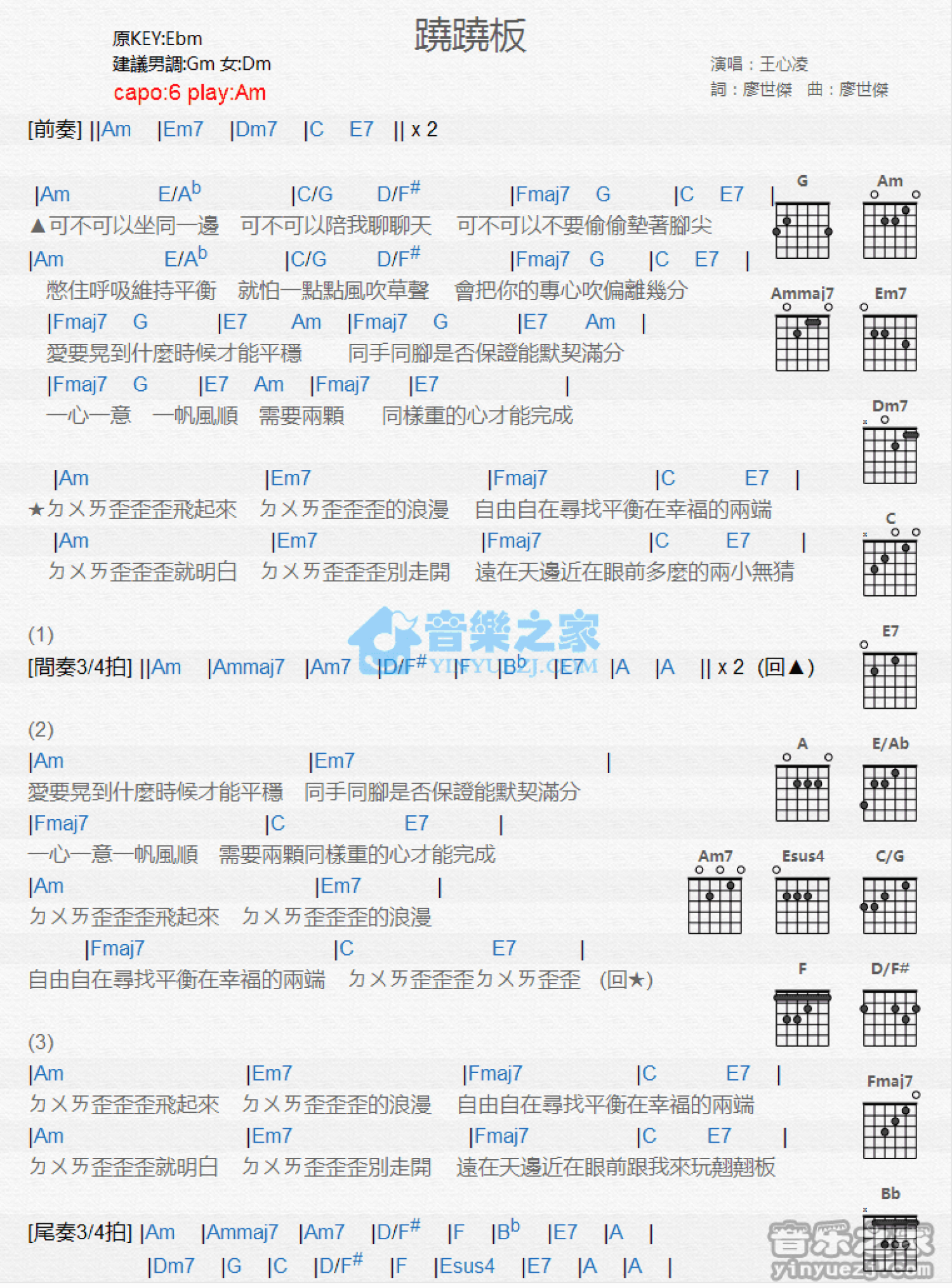 曲谱介绍: Am调版 王心凌《跷跷板》吉他和弦弹唱谱