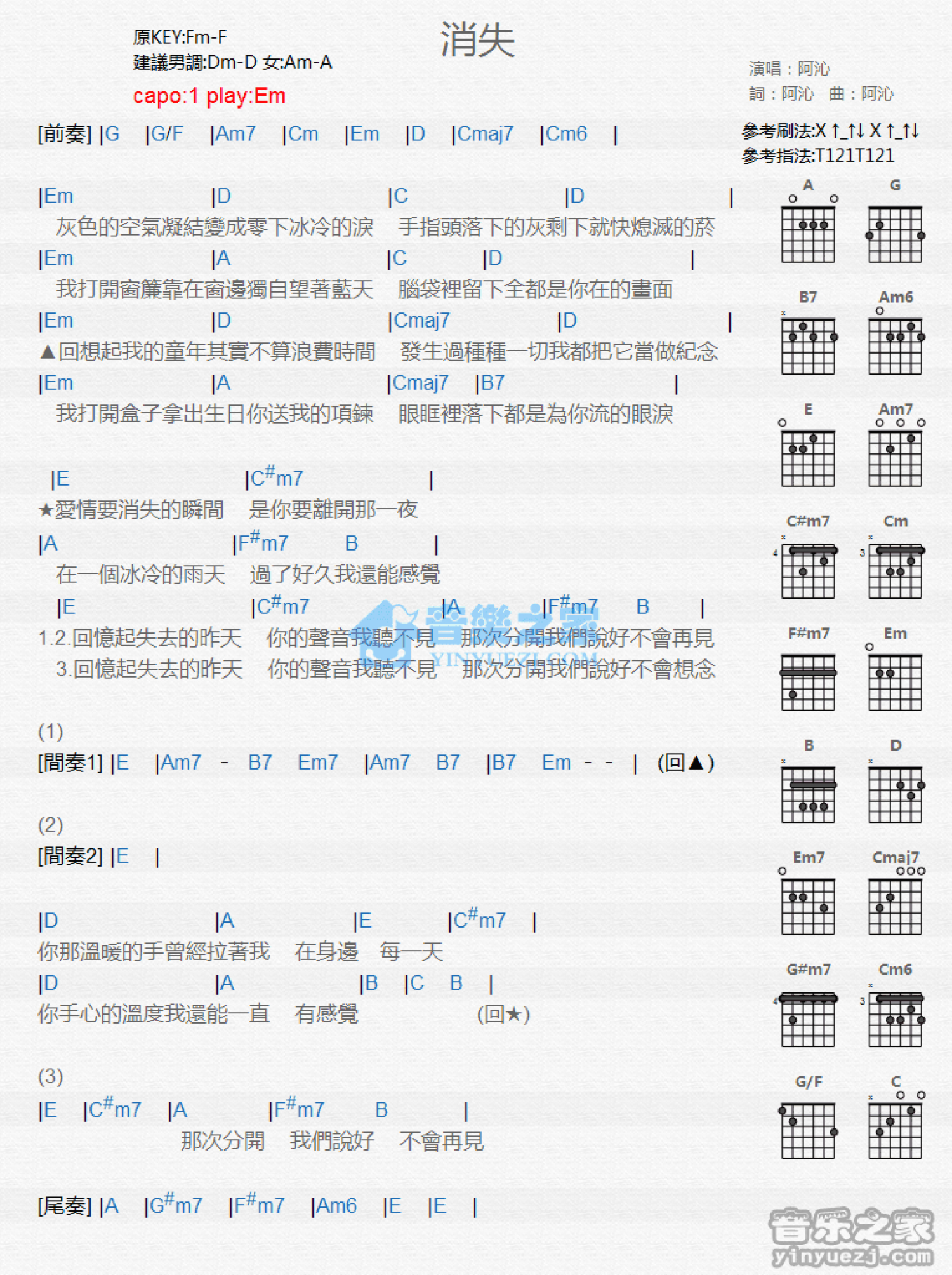 曲谱介绍: Em调版阿沁《消失》吉他和弦弹唱谱