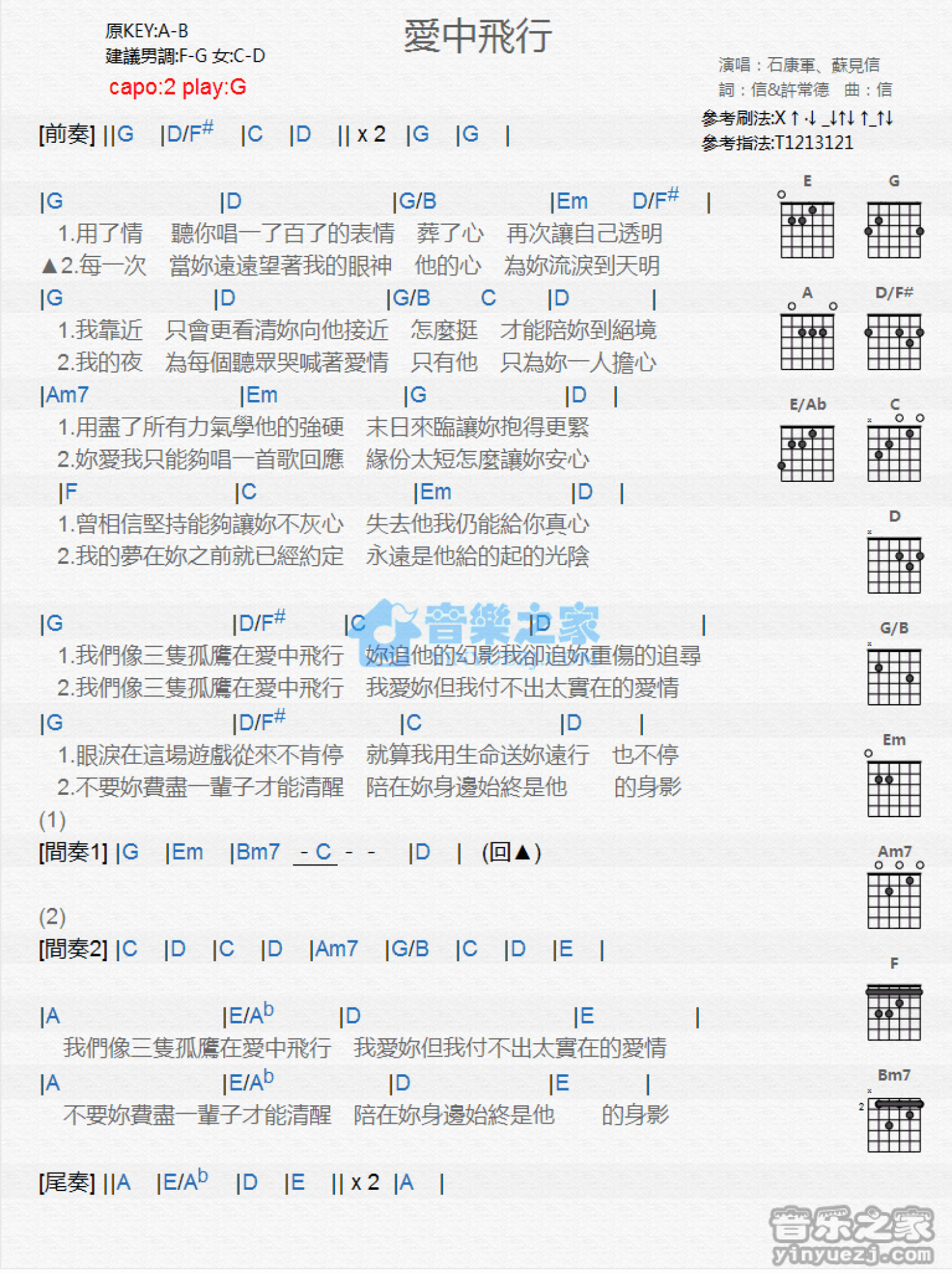 曲谱介绍: G调版石康军/苏见信《爱中飞行》吉他和弦弹唱谱